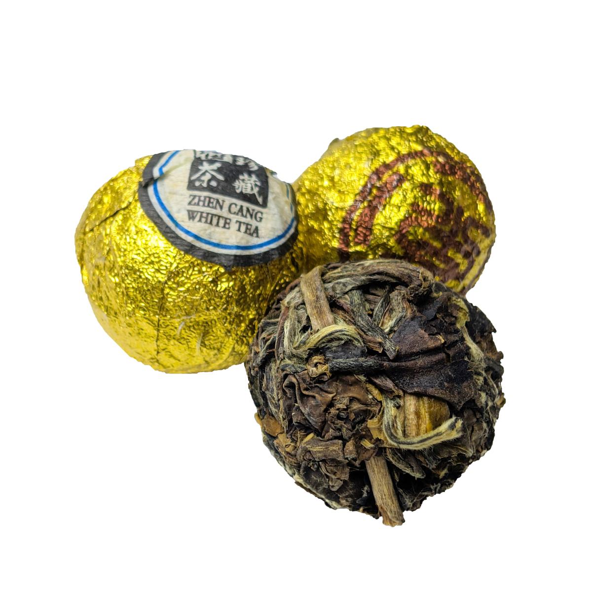 Китайский белый чай "Шоу Мэй" (Брови Старца), многолетний, спрессованный в шарики по 5 г. Этот белый чай с годами становится только лучше.