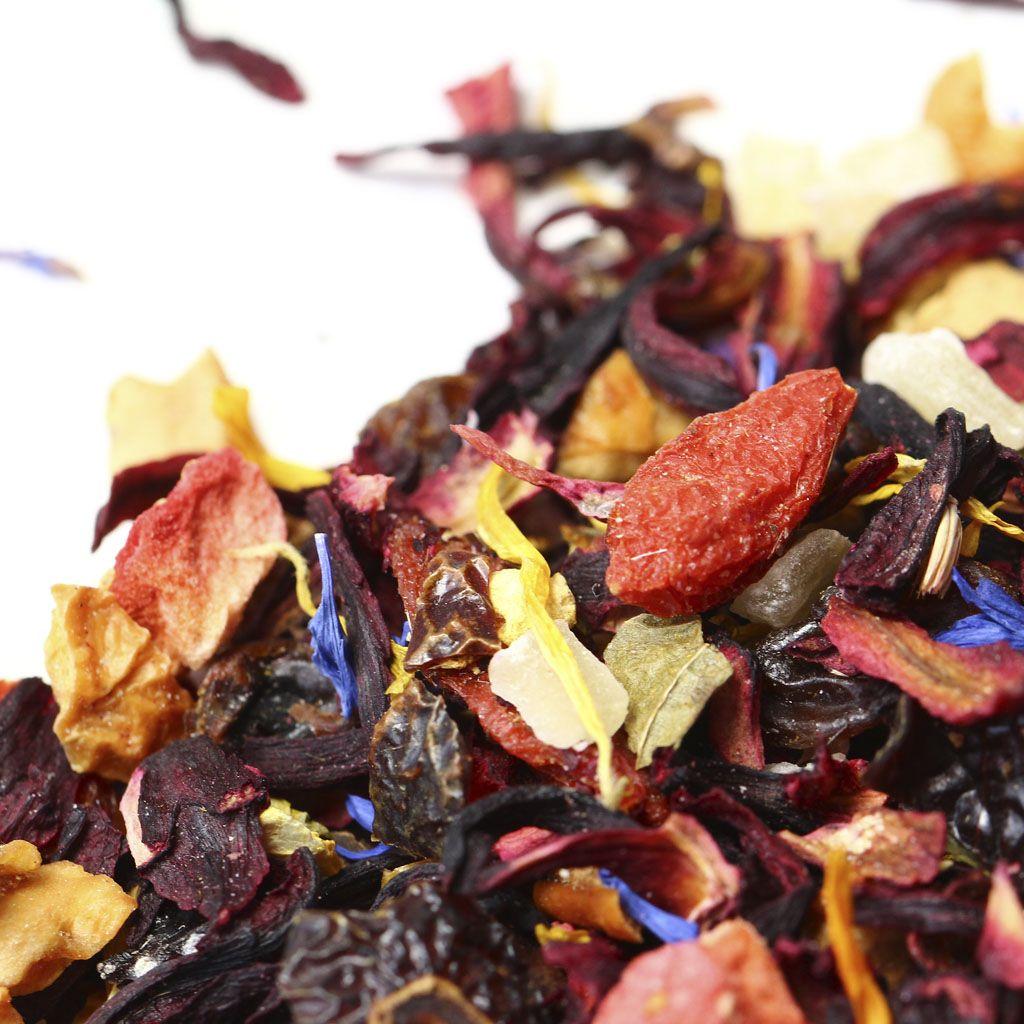 Сочный насыщенный микс на основе каркадэ вобрал в себя аппетитные кусочки ананаса, яблок, папайи и клубники. Смесь дополнена красным изюмом, ягодами Годжи и измельченными плодами шиповника, приправлена цедрой апельсина, листьями смородины и цветочными лепестками календулы и василька. О более лакомом сочетании невозможно мечтать!