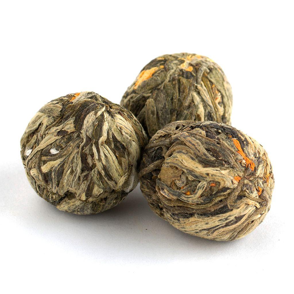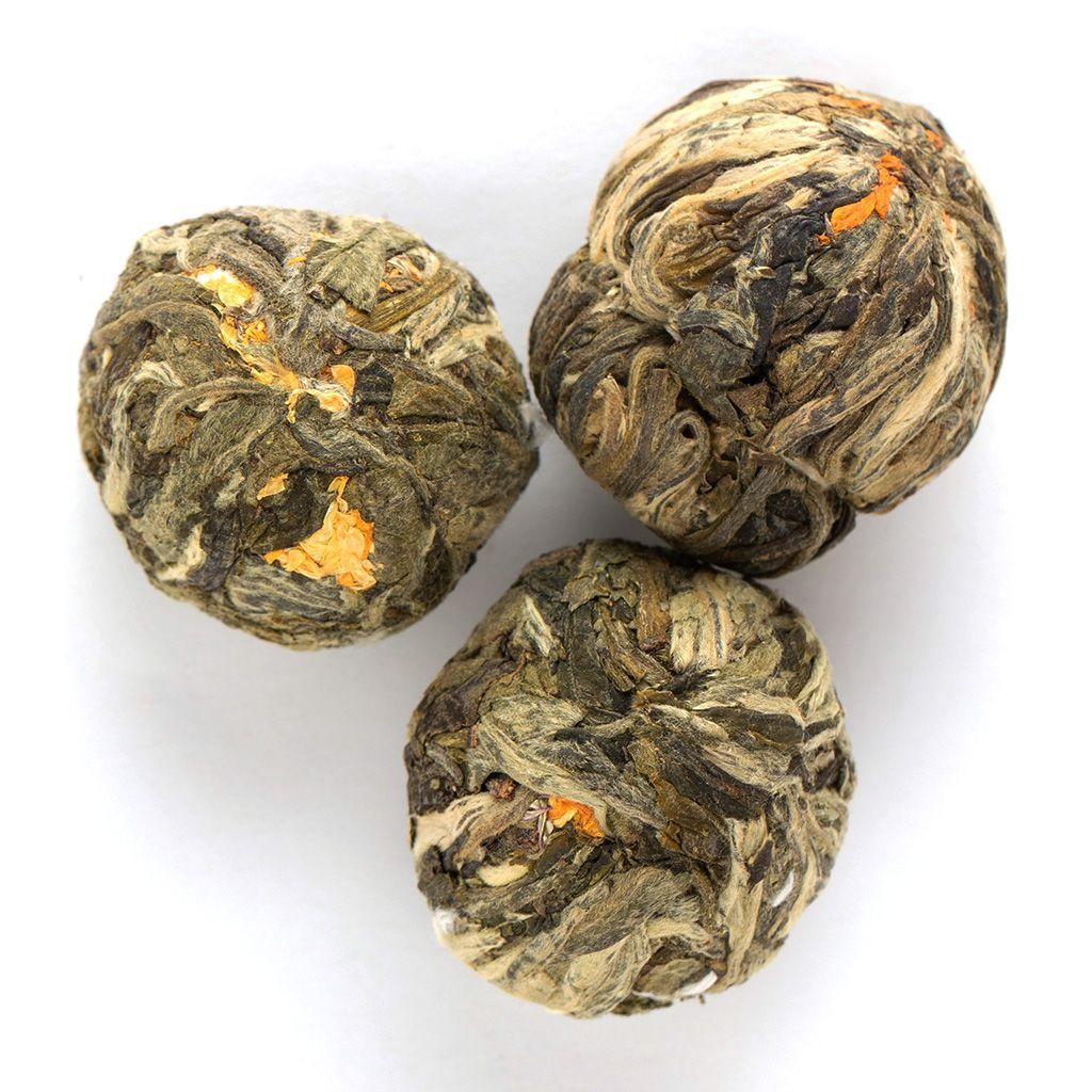 Зелёный связаный чай из провинции Фуцзянь в виде, подрезанного снизу, шарика. В ...