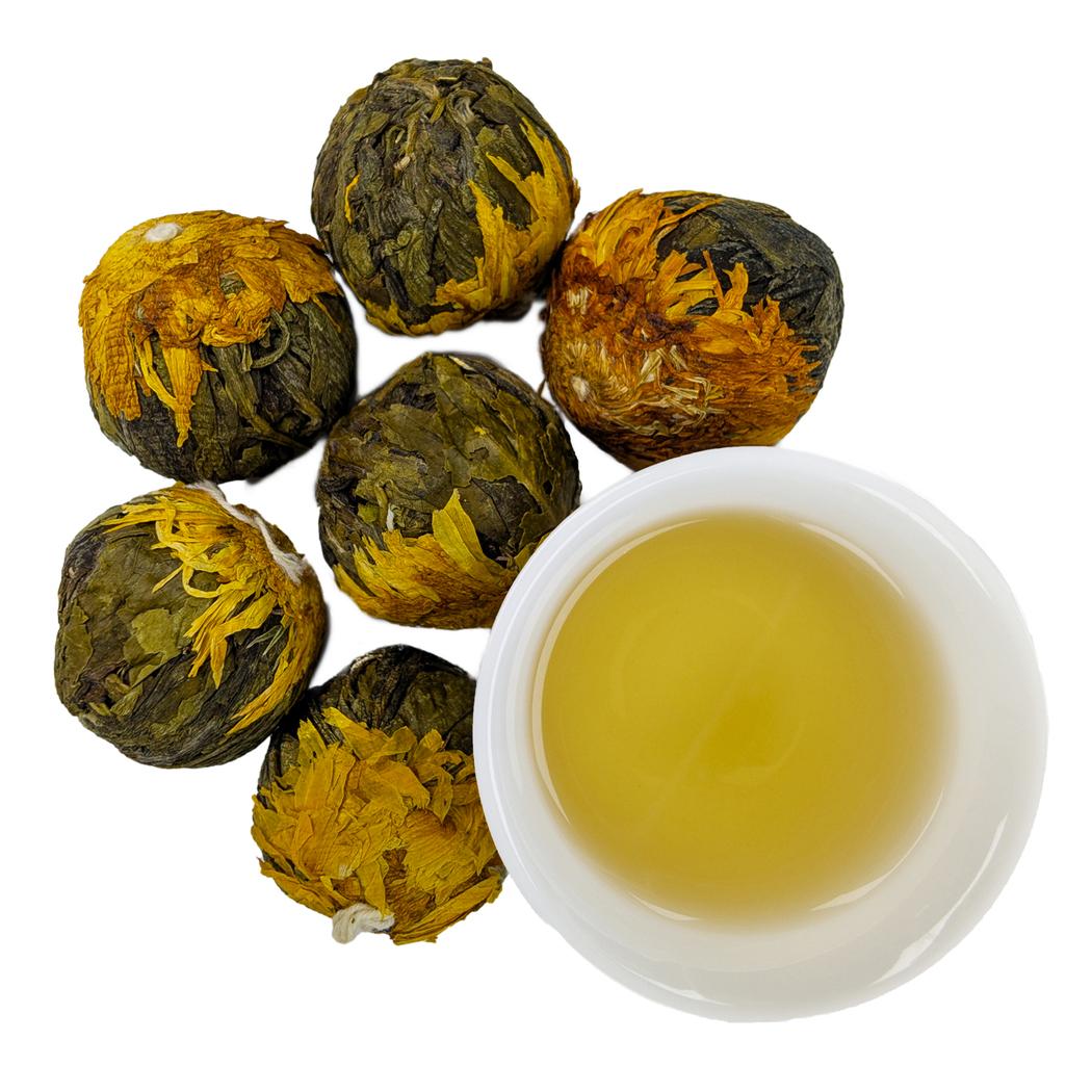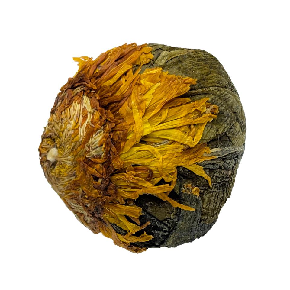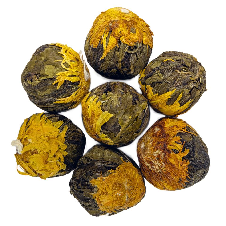 Форма туго связанного чайного шарика благоприятствует сохранению в нём ценных органических веществ, а также позволяет хранить зелёный чай намного дольше, чем в рассыпном виде. Если заварить этот чай – распускается пышный, огромный зелёный цветок с белой сердцевиной из нежных хризантем.