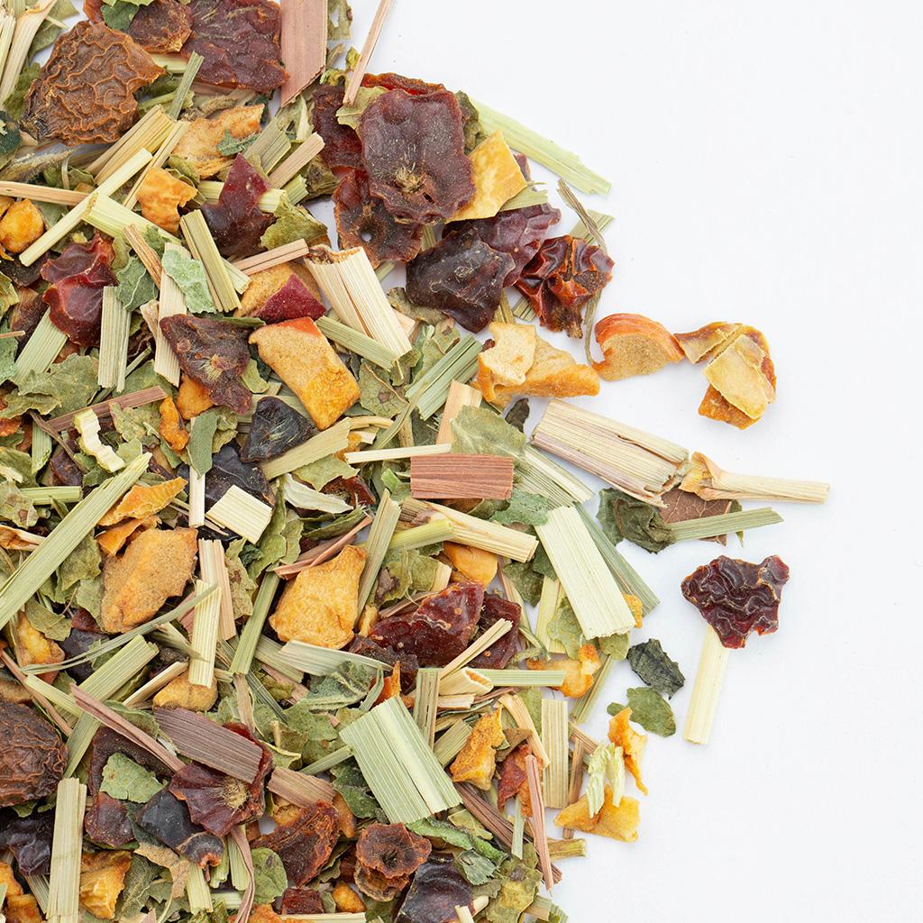 В состав сбора входят - эхинацея, шиповник измельченный, кусочки яблок, лемонграс, листья смородины, мята, крапива.