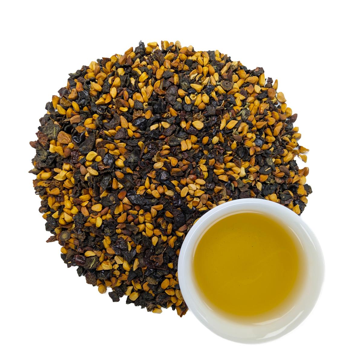 В состав чайного напитка "Шиповник с Чабрецом" входят королевский шиповник и чабрец.