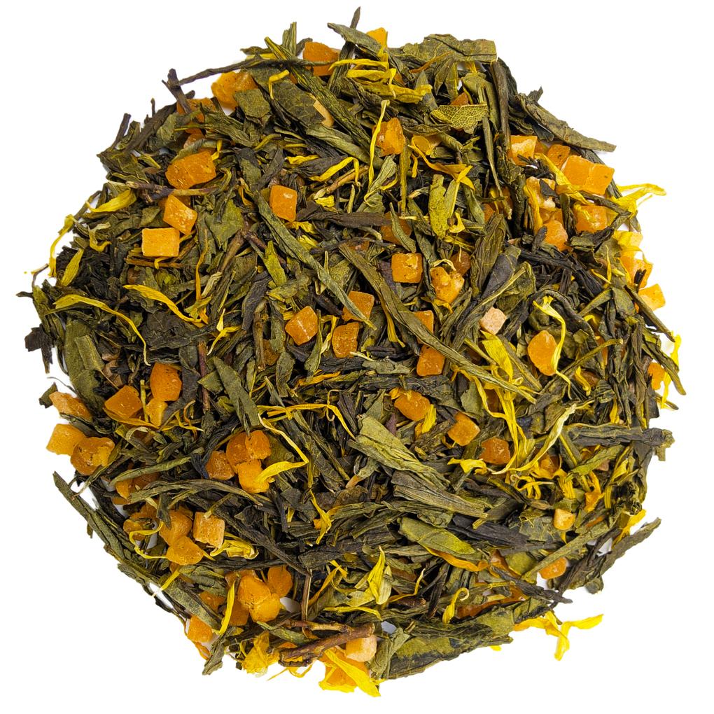 В состав зеленого чая "Солнечный Персик" входят: ароматная китайская сенча, цукаты, золотистые лепестки календулы и ароматические масла.