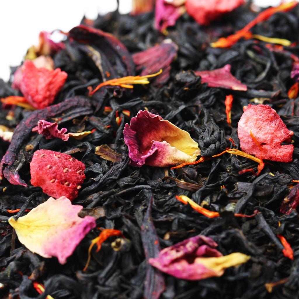 Чай черный индийский, кусочки клубники, лепестки розы, каркадэ, лепестки сафлора, лепестки красного василька, аромат садовой земляники.