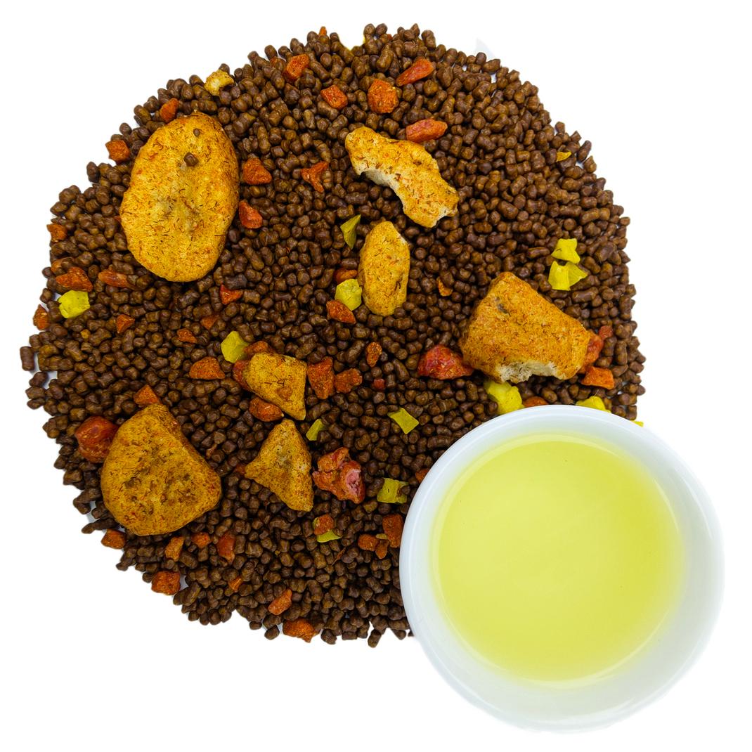 В состав Гречишного чая «Клубника-Банан» помимо самого гречишного чая КуЦяо входят кусочки спелой клубники, кусочки банана, красные и желтые цукаты, огненные лепестки сафлора и ароматизатор.