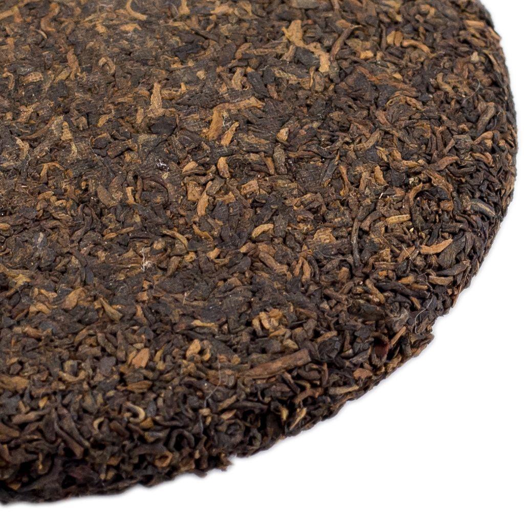 Маленький блинчик темного пуэра из мелколистового сырья с большим количеством почек, очень плотной прессовки.