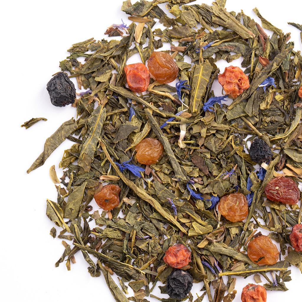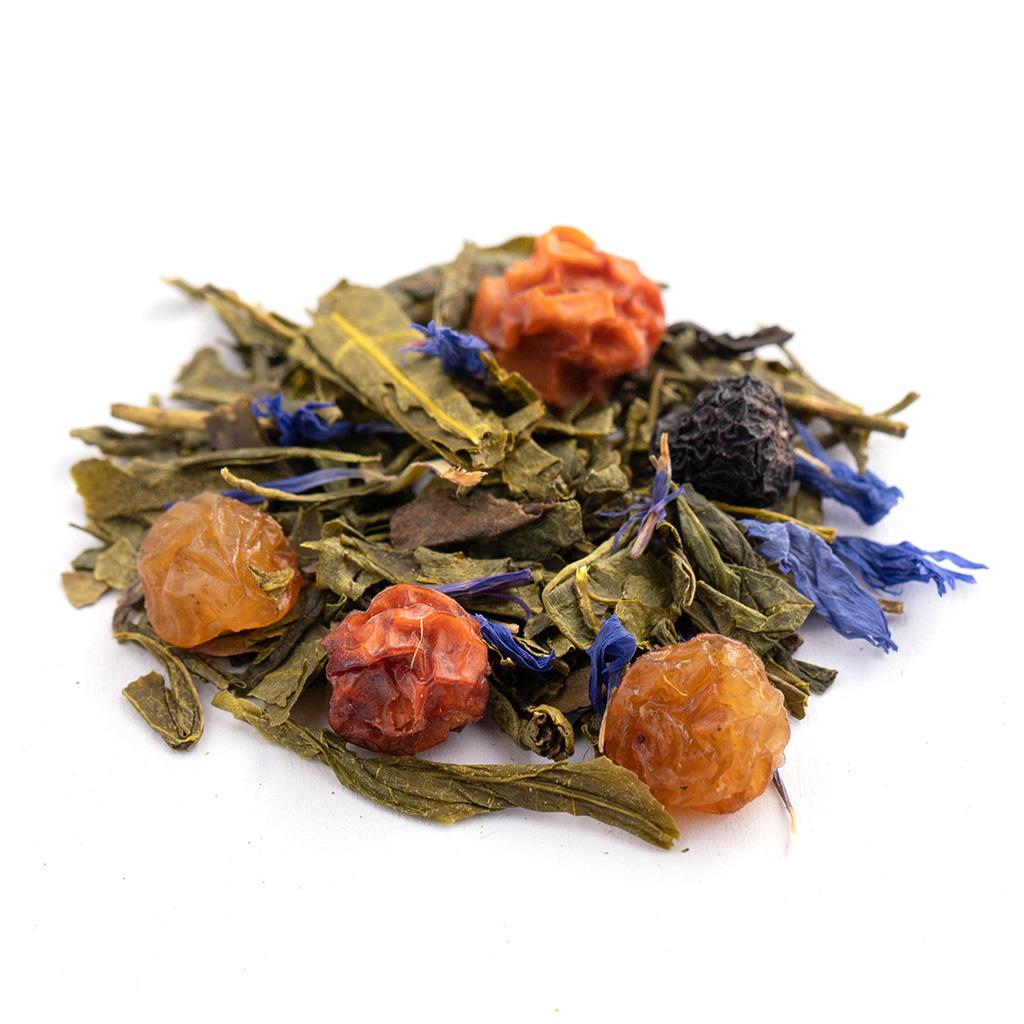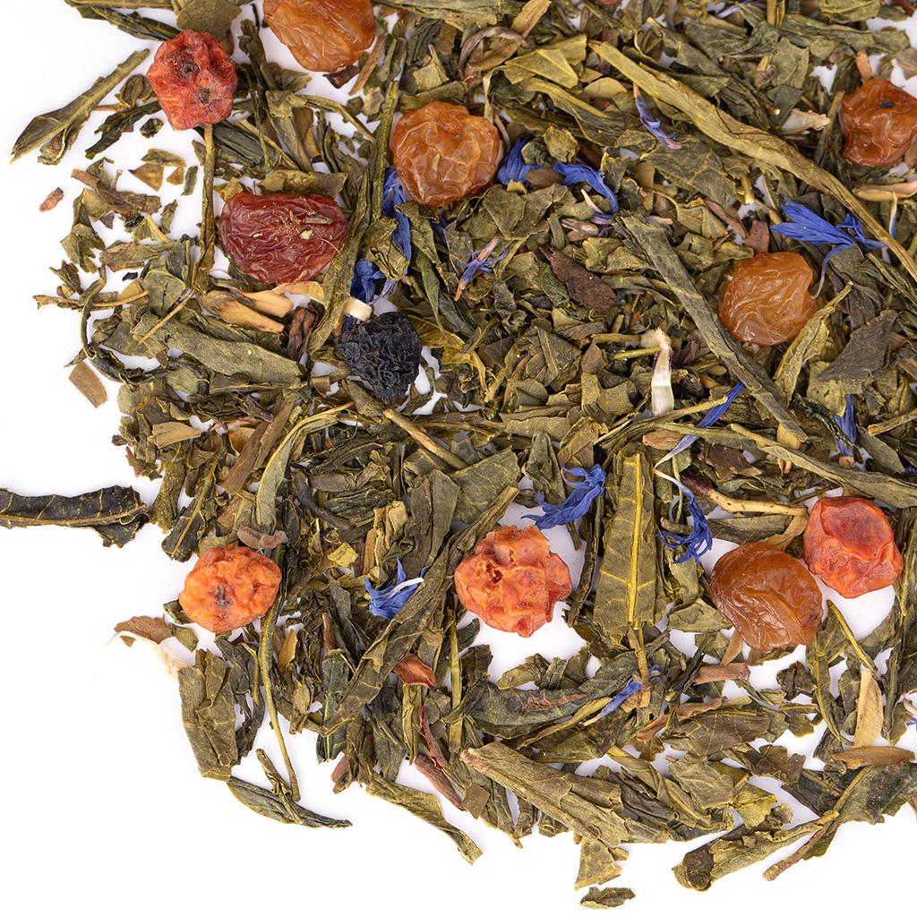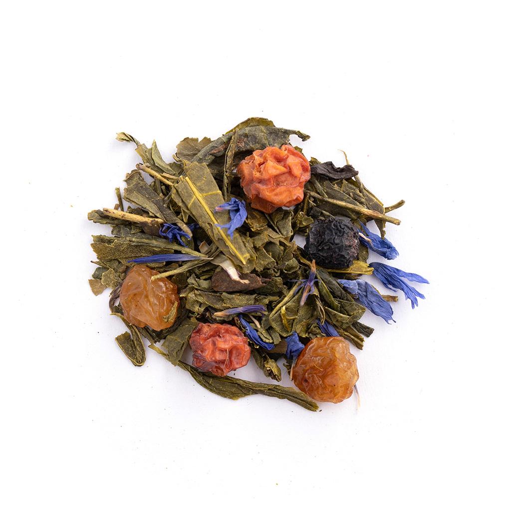 Состав: чай зеленый китайский, изюм, красная рябина, плоды аронии, лепестки василька, аромат фруктового джема.