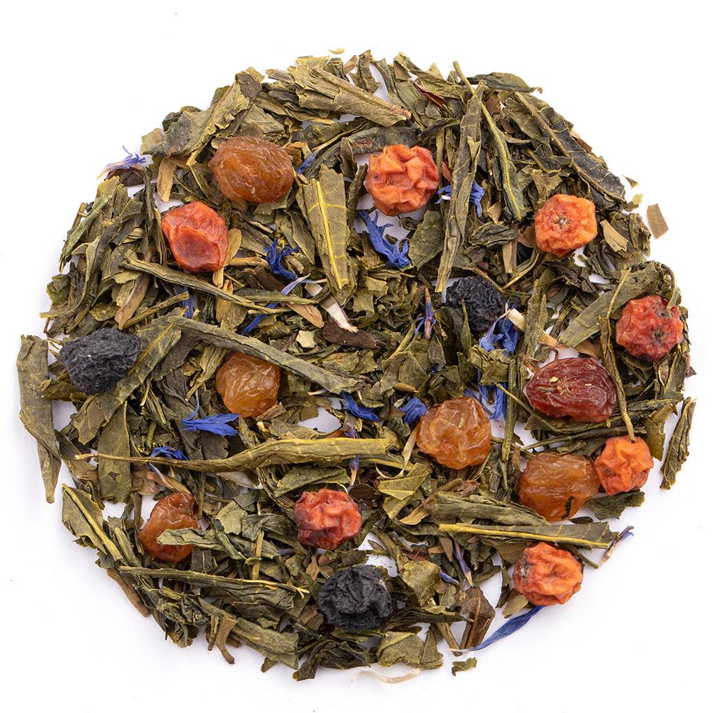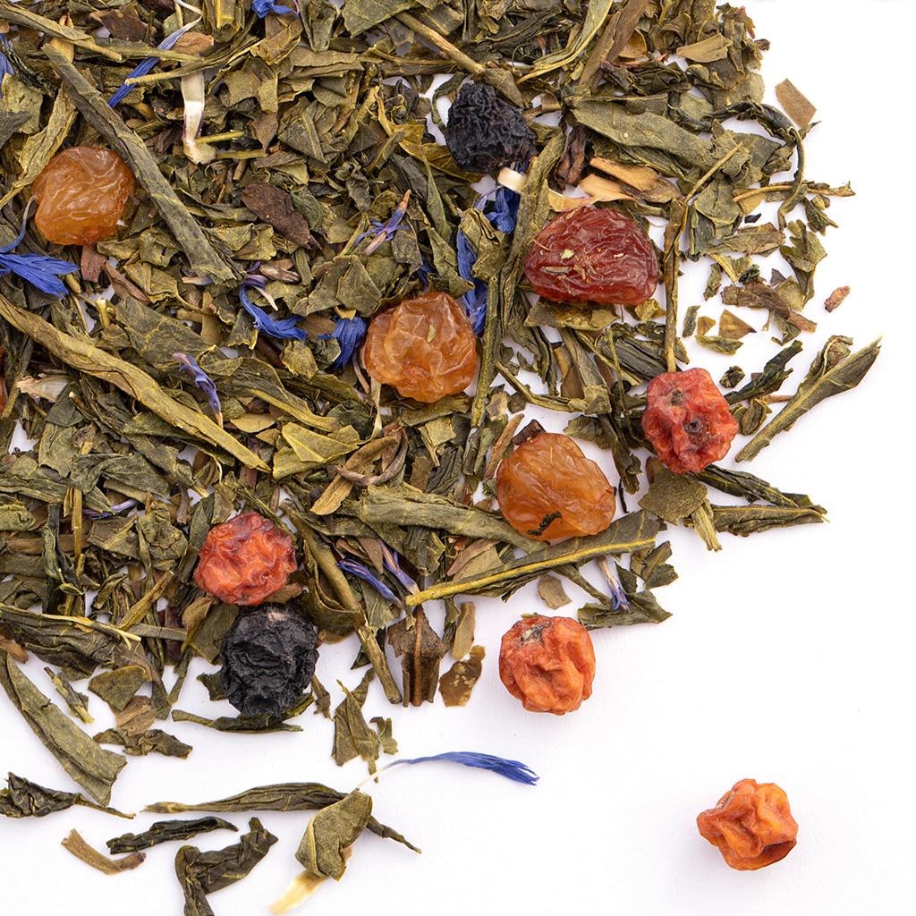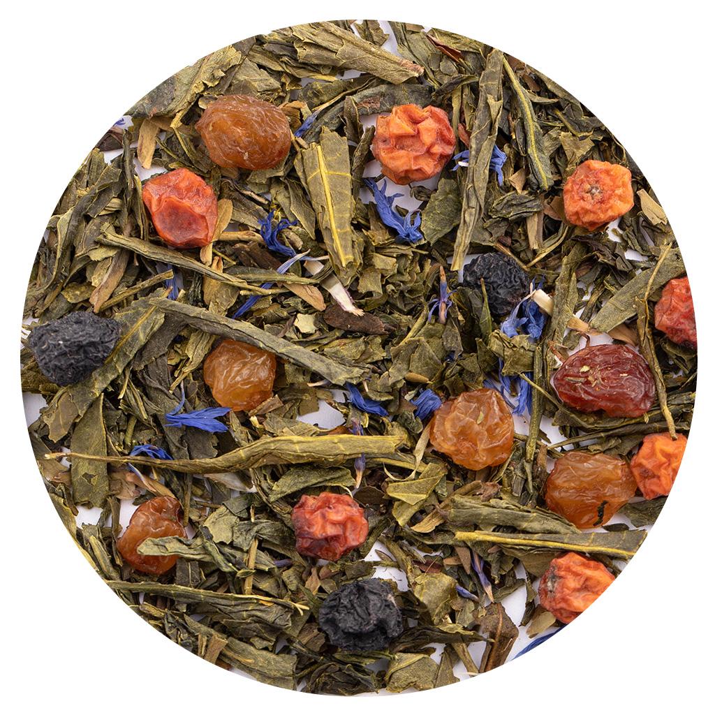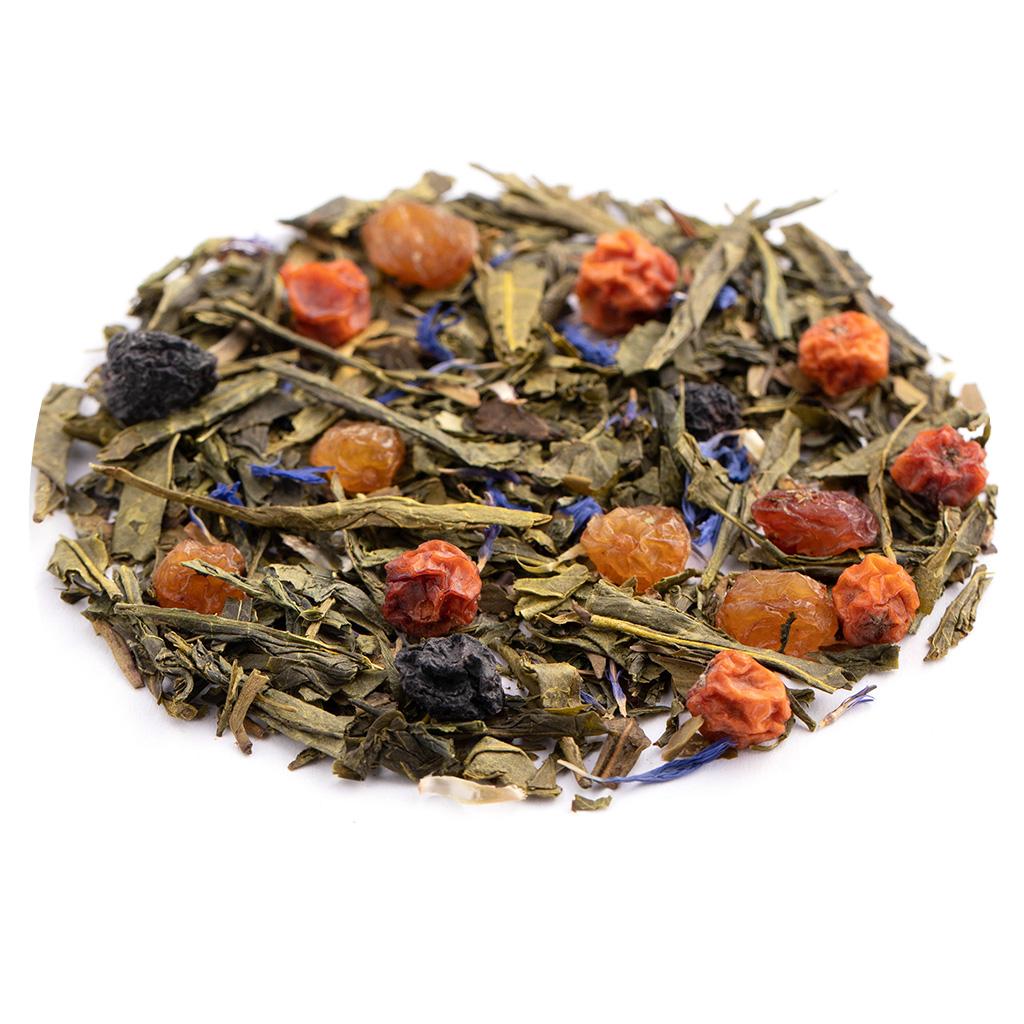 Состав: чай зеленый китайский, изюм, красная рябина, плоды аронии, лепестки василька, аромат фруктового джема.