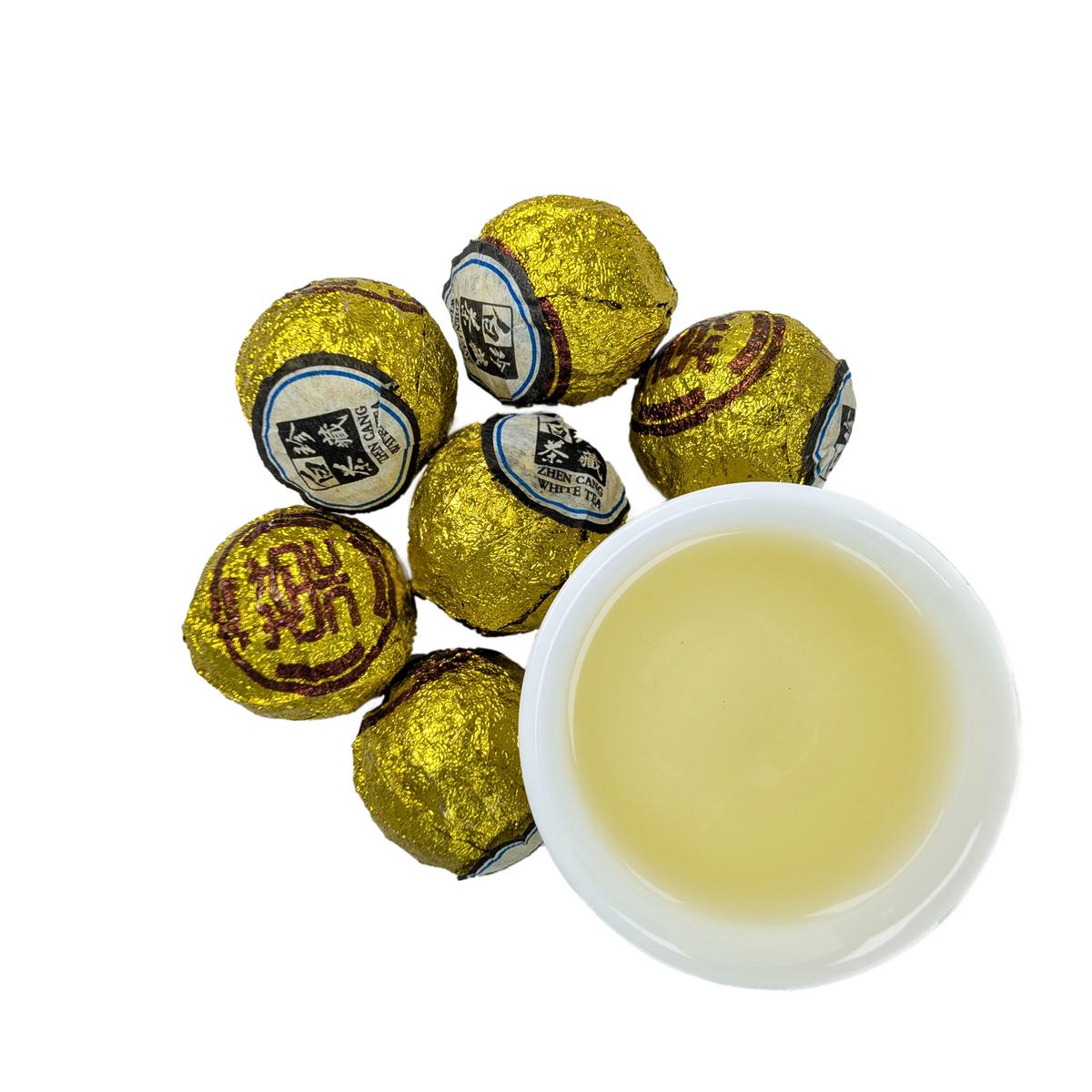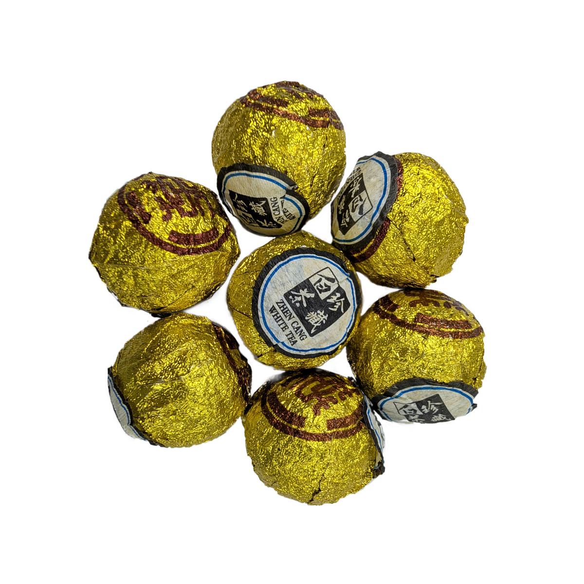 Китайский белый чай "Шоу Мэй" (Брови Старца), многолетний, спрессованный в шарики по 5 г. Этот белый чай с годами становится только лучше.