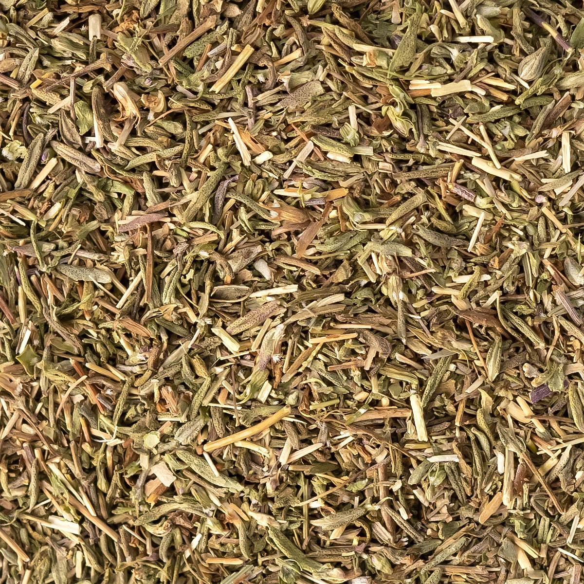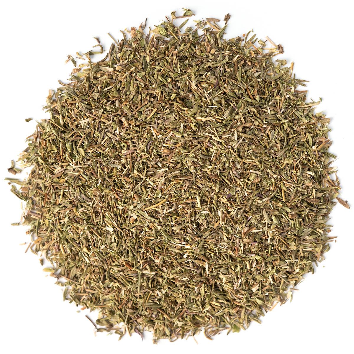 Измельчённая трава чабреца: тонкие веточки и листья чабреца срезают и высушивают в тени, избегая открытых солнечных лучей, затем измельчают.