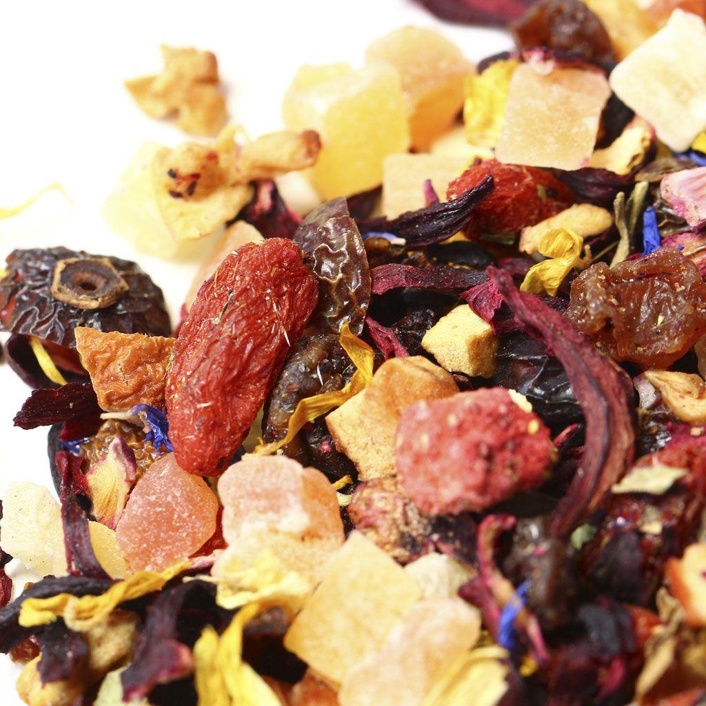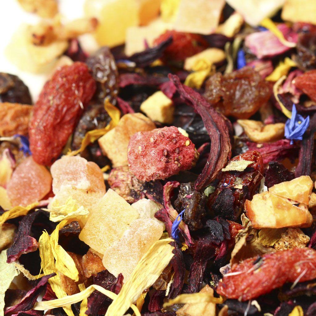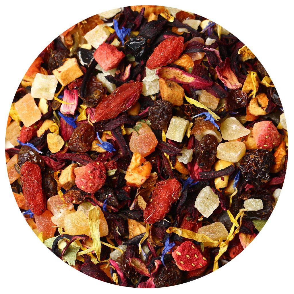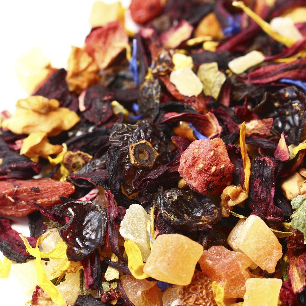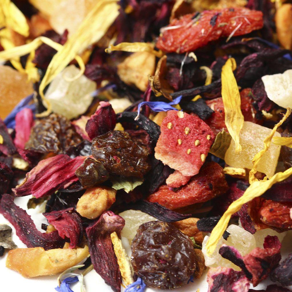 Сочный насыщенный микс на основе каркадэ вобрал в себя аппетитные кусочки ананаса, яблок, папайи и клубники. Смесь дополнена красным изюмом, ягодами Годжи и измельченными плодами шиповника, приправлена цедрой апельсина, листьями смородины и цветочными лепестками календулы и василька. О более лакомом сочетании невозможно мечтать!