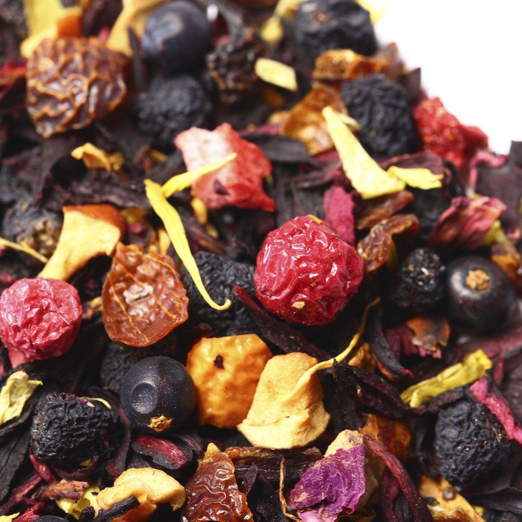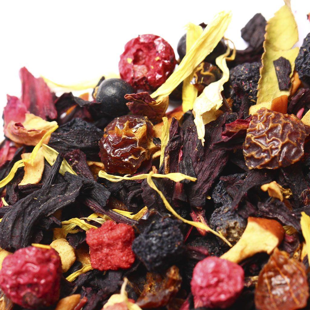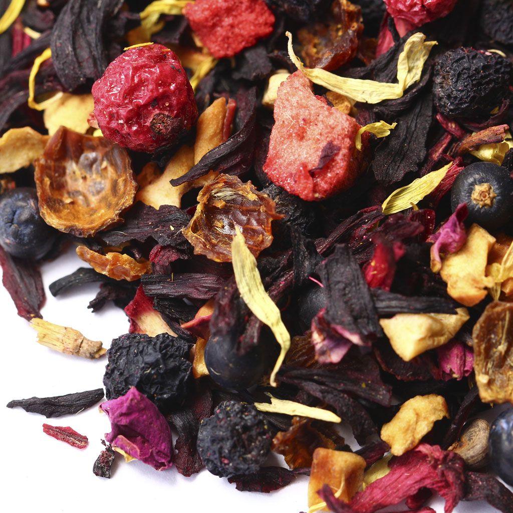Богатая насыщенная композиция включает приятную кислинку каркадэ, кусочков яблок, измельченных плодов шиповника, ягод красной смородины, вяжущую сладость черноплодной рябины, терпкость плодов можжевельника, изысканную сладость клубники. Дополняют композицию лепестки календулы и красной розы.