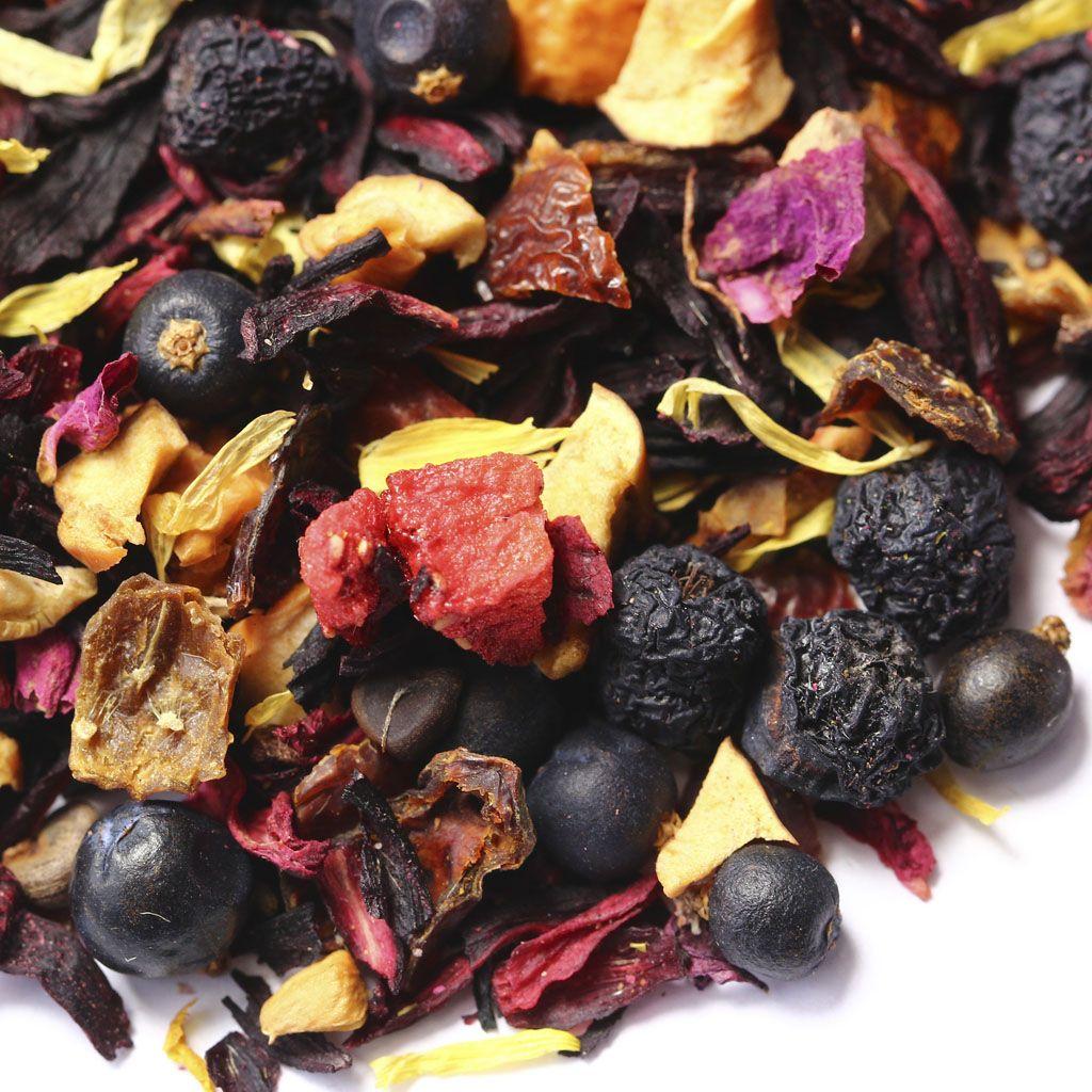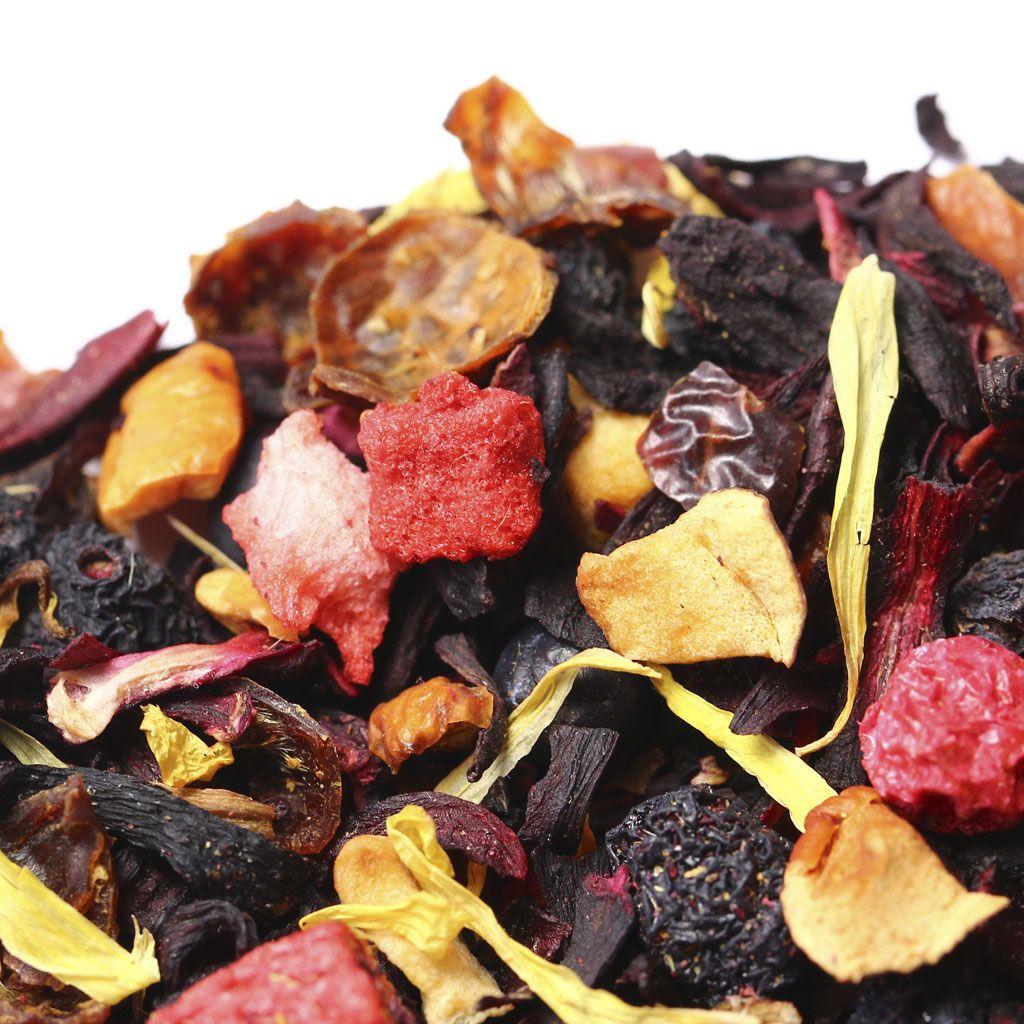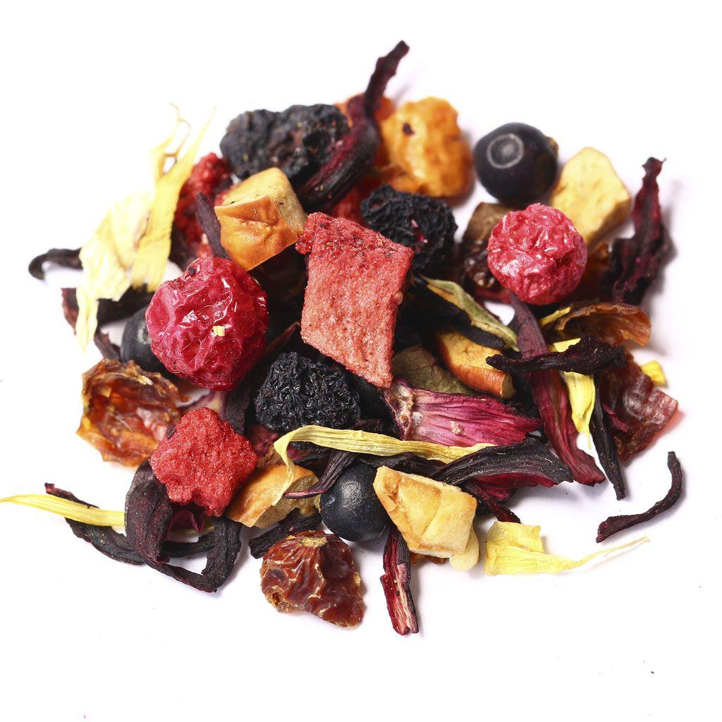 Богатая насыщенная композиция включает приятную кислинку каркадэ, кусочков яблок, измельченных плодов шиповника, ягод красной смородины, вяжущую сладость черноплодной рябины, терпкость плодов можжевельника, изысканную сладость клубники. Дополняют композицию лепестки календулы и красной розы.