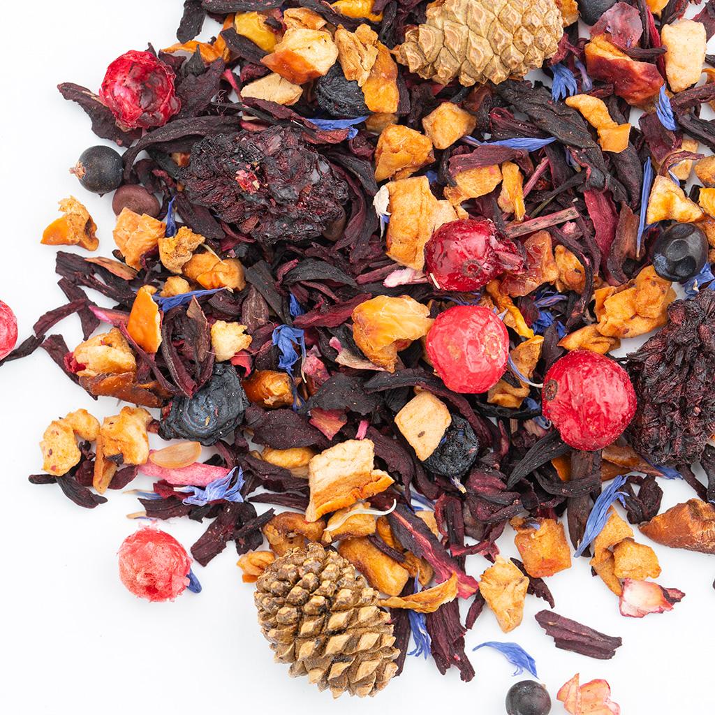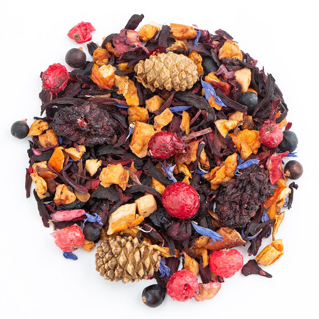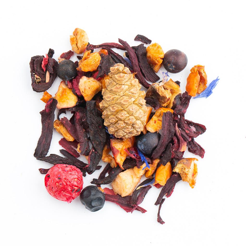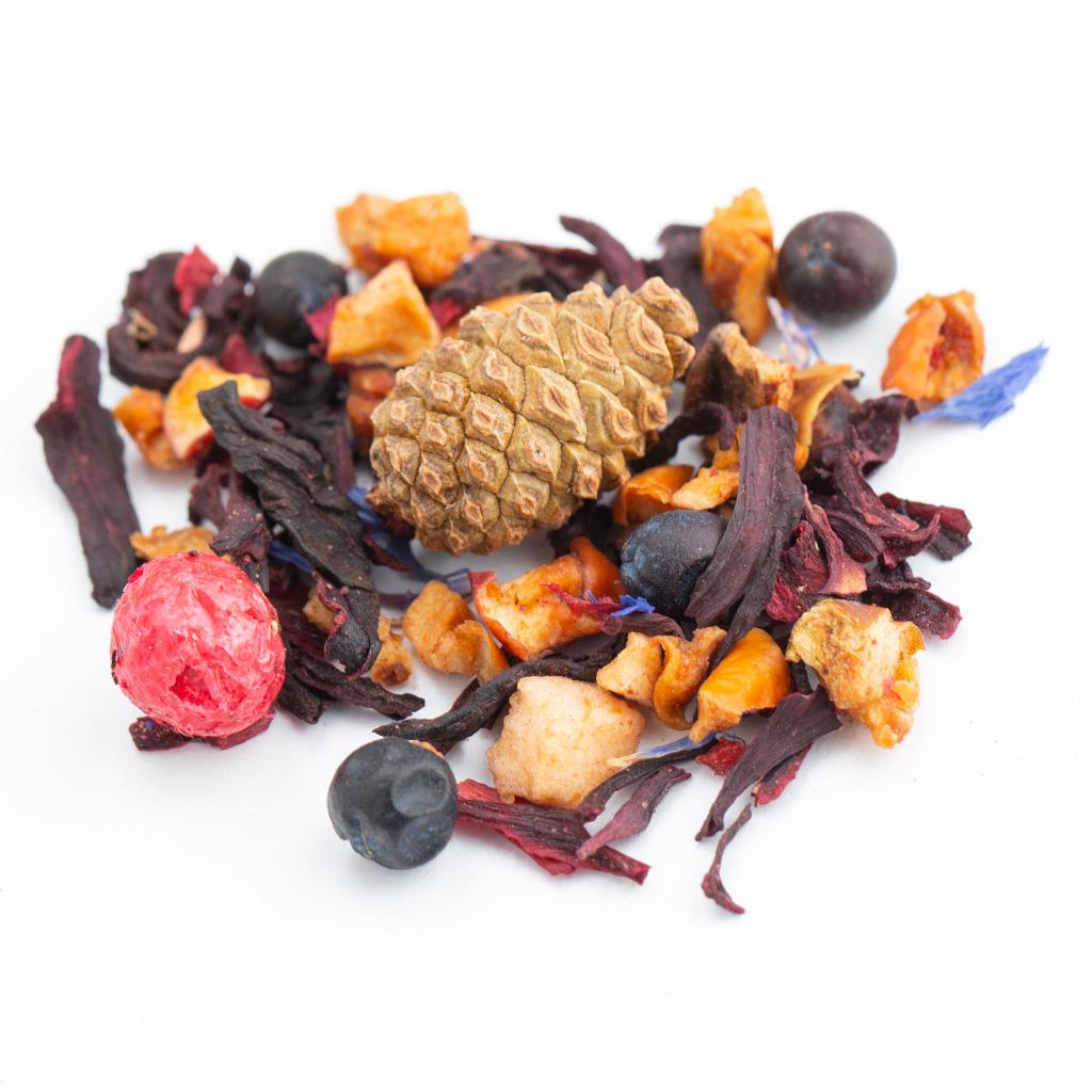 Фруктовая смесь на основе каркадэ. В составе кусочки яблок, сосновые шишки, плоды можжевельника, ягоды ежевики, ягоды красной смородины, ягоды голубики, лепестки василька,
