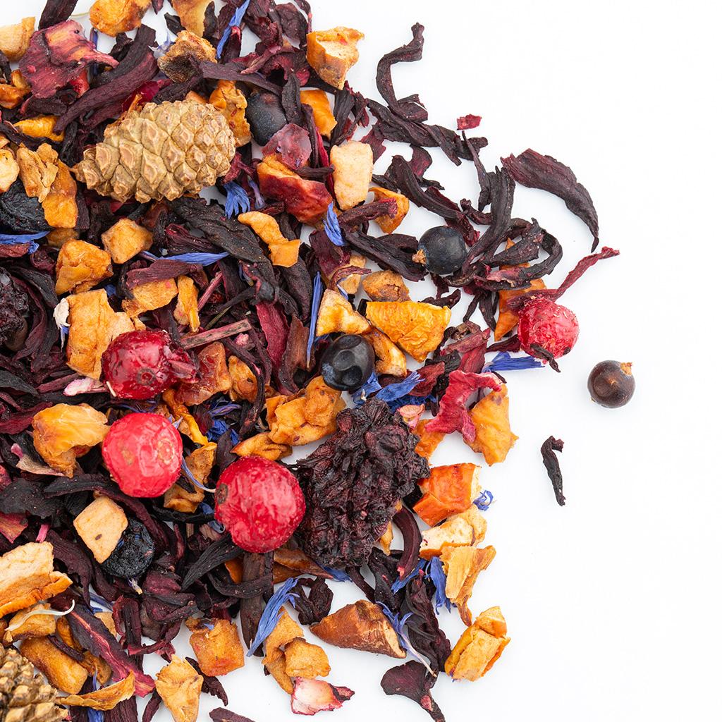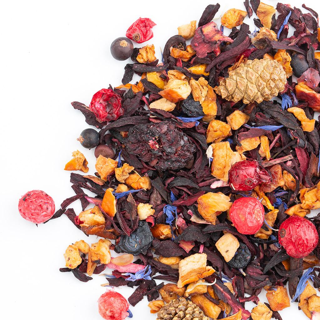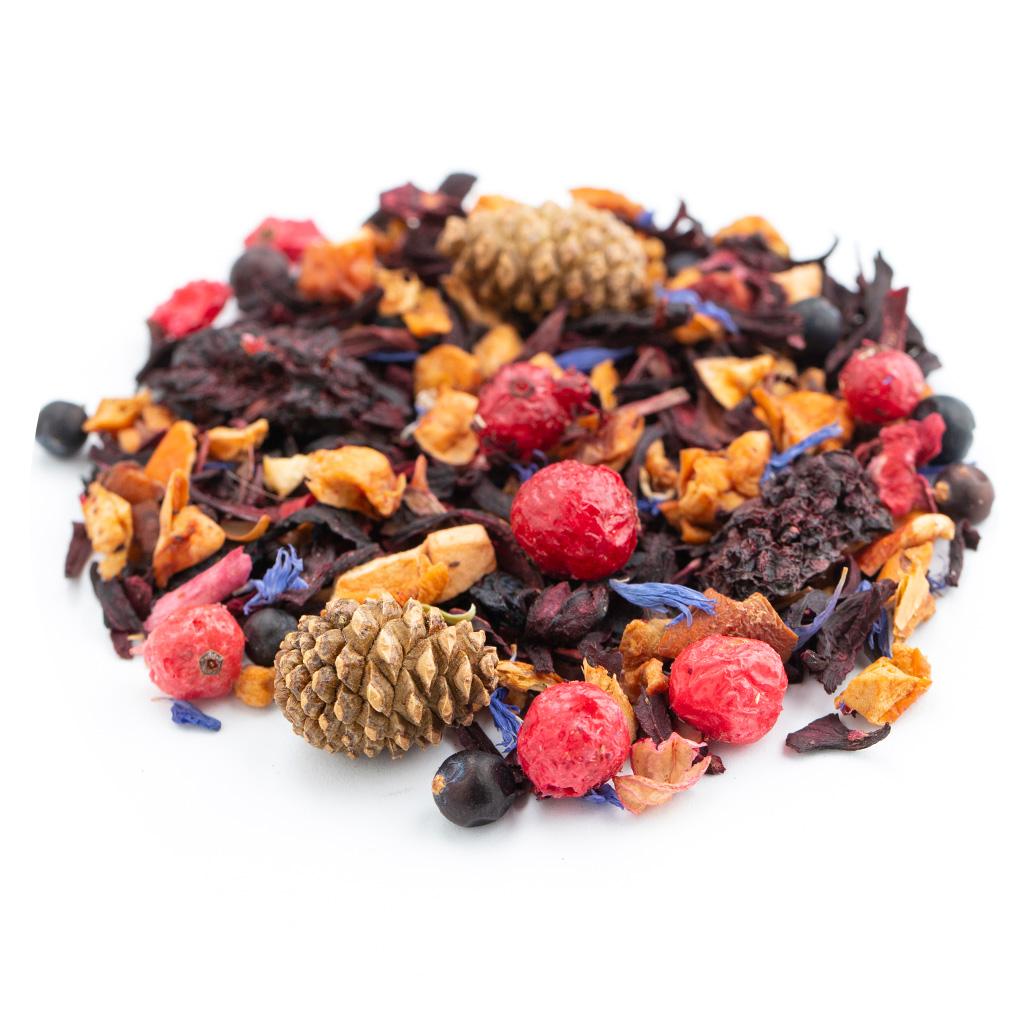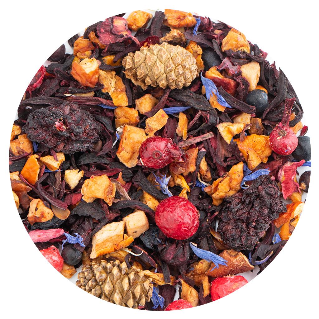 Фруктовая смесь на основе каркадэ. В составе кусочки яблок, сосновые шишки, плоды можжевельника, ягоды ежевики, ягоды красной смородины, ягоды голубики, лепестки василька,