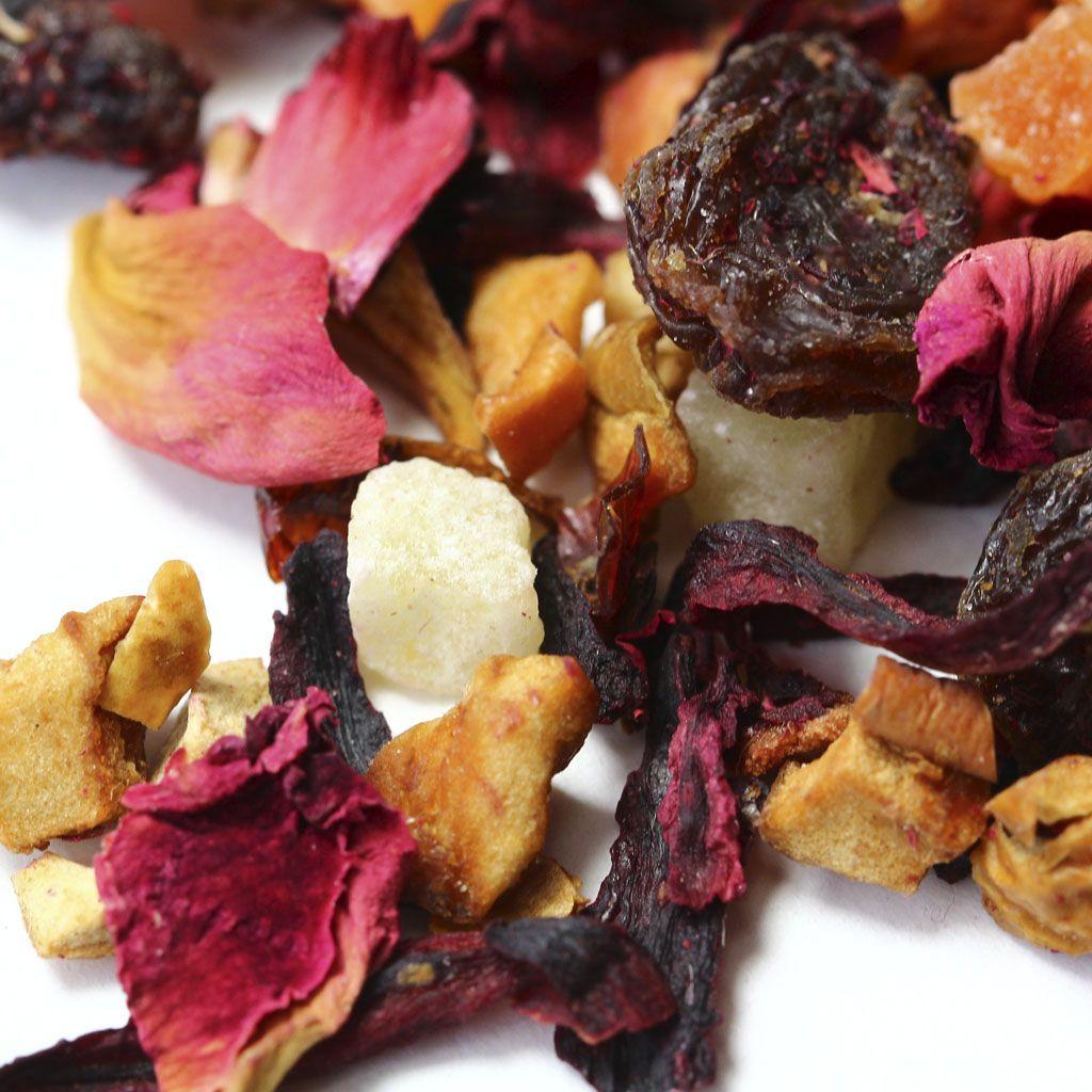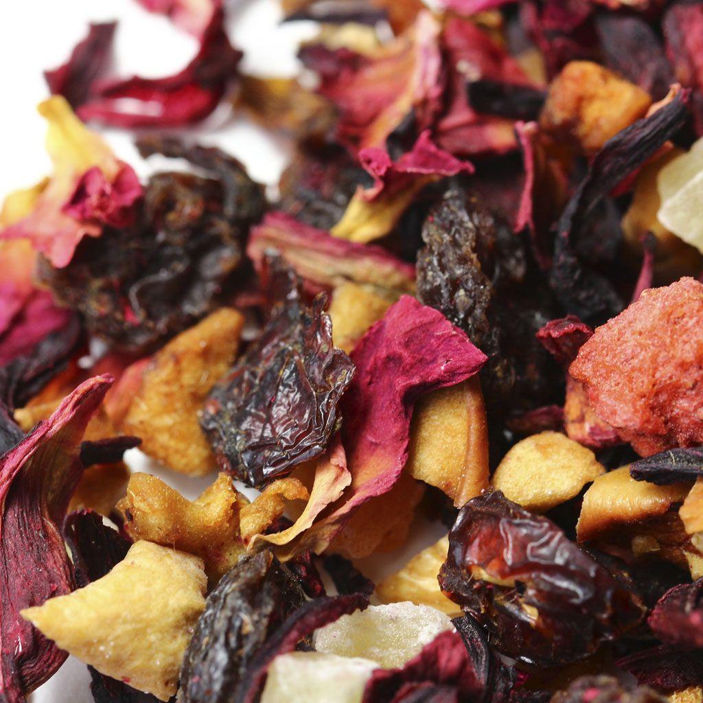 Оригинальное вкусовое сочетание каркадэ, кусочков яблок и ананаса, красного изюма, лепестков красной розы и кусочков клубники творит чудеса, наполняя душу воодушевлением и спокойствием.