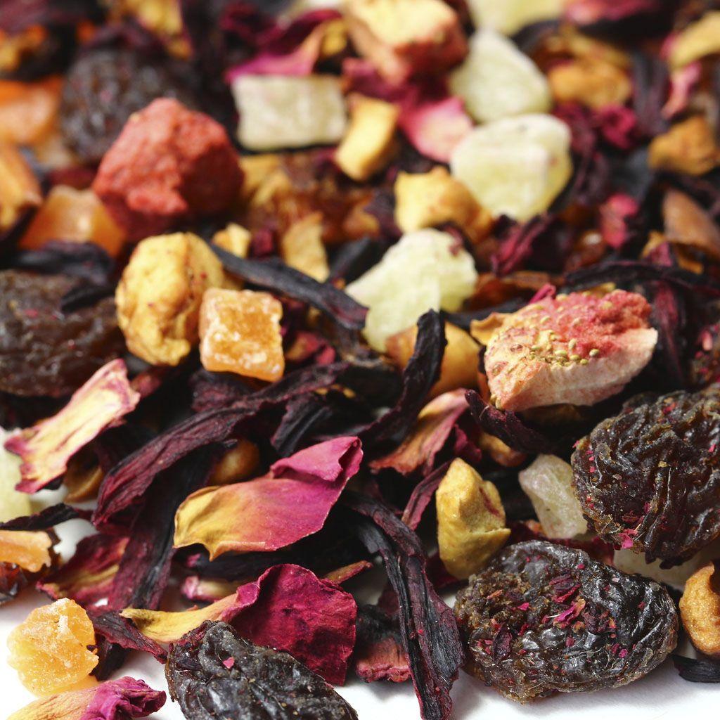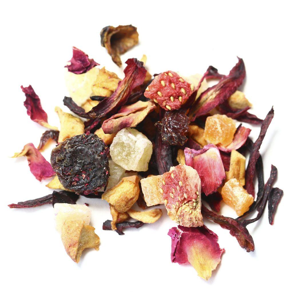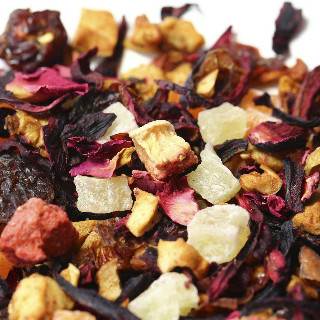 Бархатистый вкус создается удивительно правильно подобранными пропорциями сладости ананаса, изюма и клубники и кислинки яблока и каркадэ.