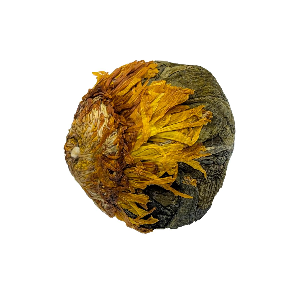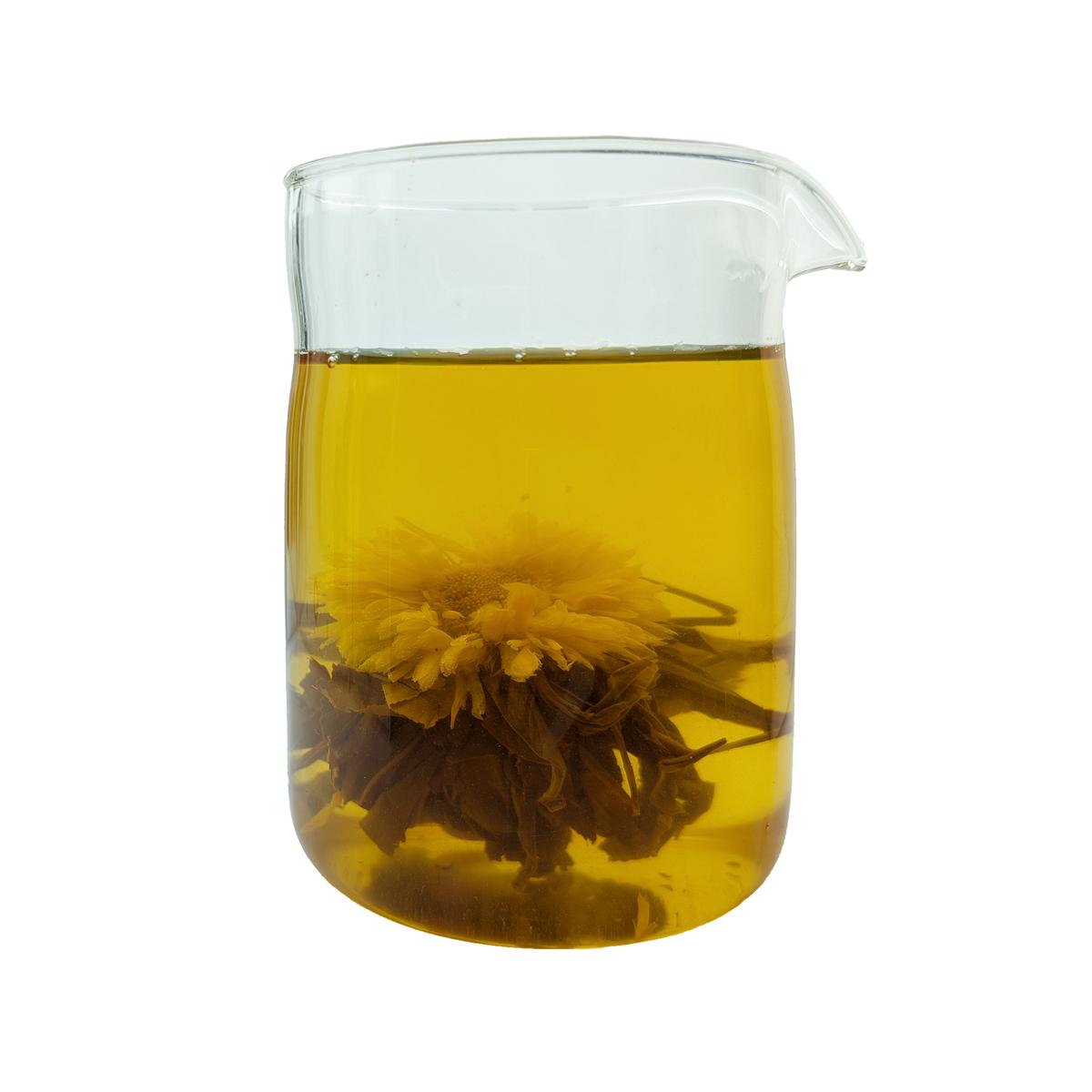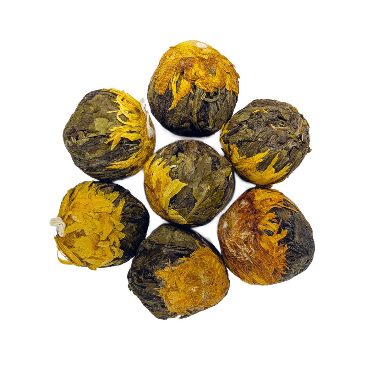 Форма туго связанного чайного шарика благоприятствует сохранению в нём ценных органических веществ, а также позволяет хранить зелёный чай намного дольше, чем в рассыпном виде. Если заварить этот чай – распускается пышный, огромный зелёный цветок с белой сердцевиной из нежных хризантем.