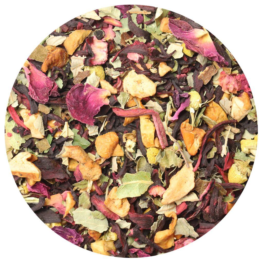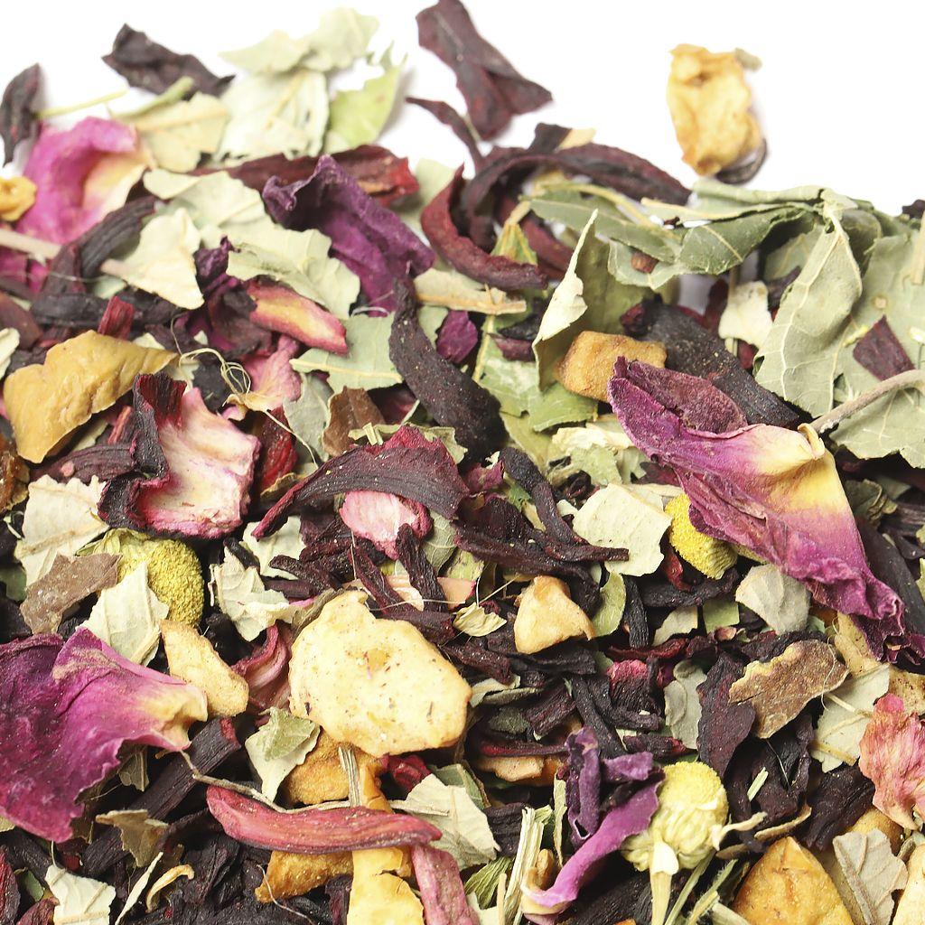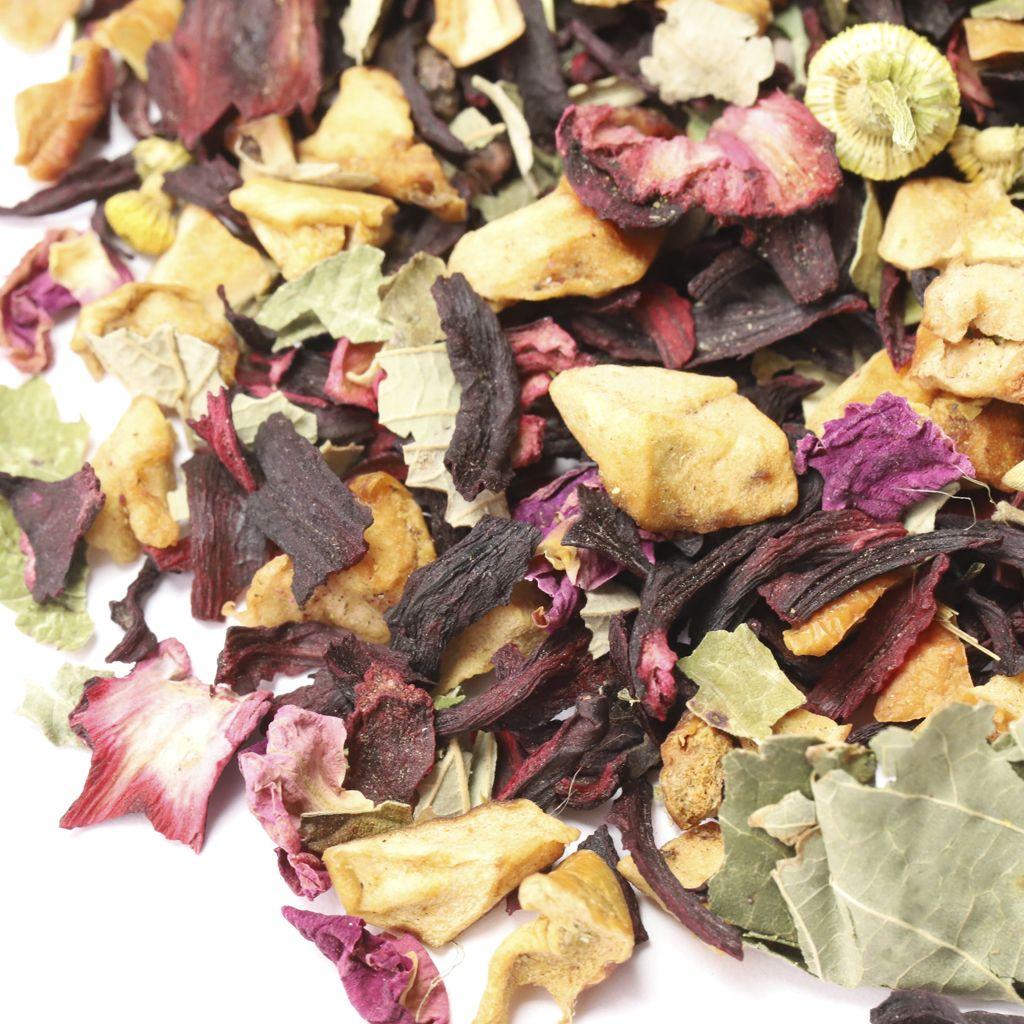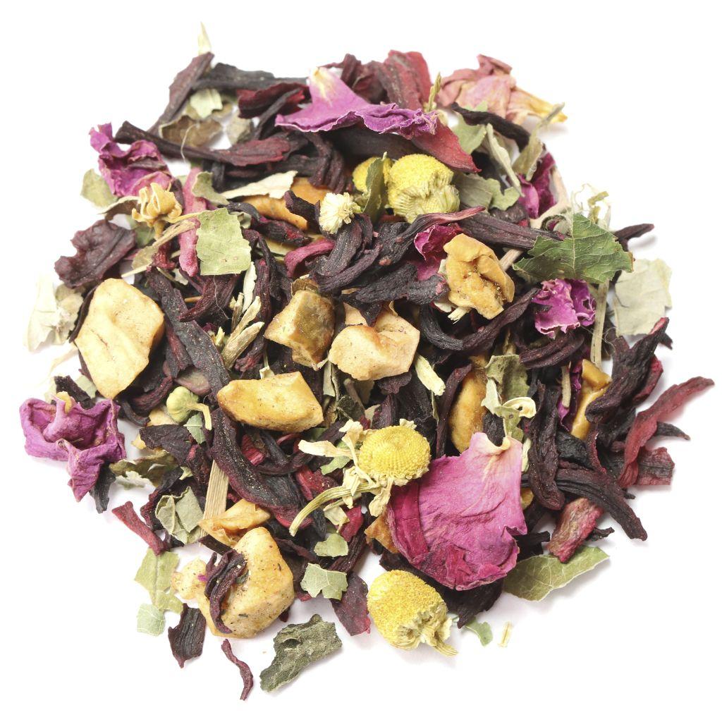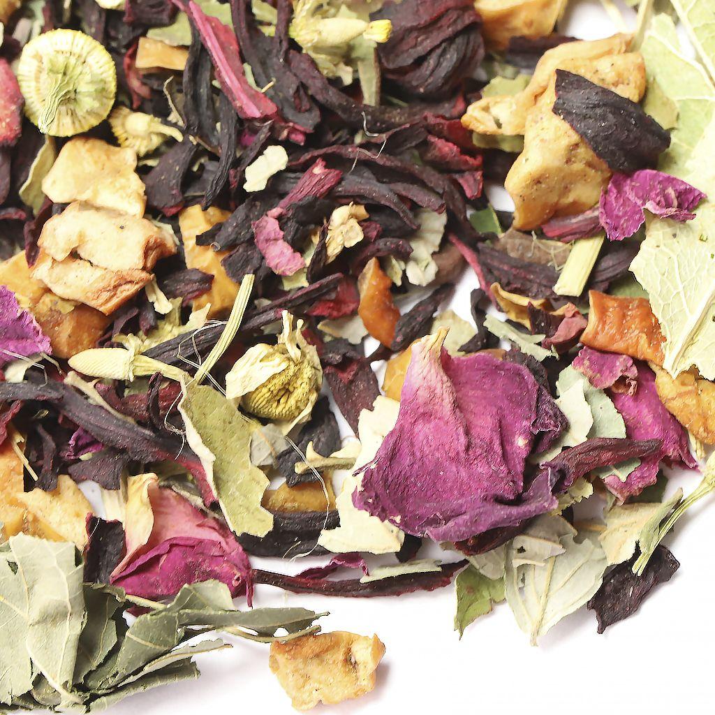 Настой насыщенно рубинового цвета обладает яркой кислинкой каркаде с яблочным оттенком и нежным обволакивающим ароматом малины и сливок. Лепестки розы вносят нотку изысканного шарма. Травяные компоненты усиливают вкус и пользу напитка.