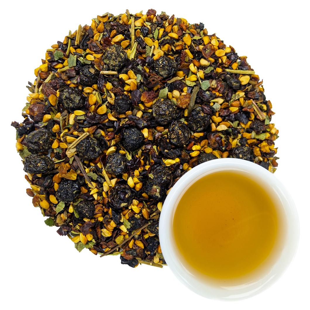 В состав этого напитка входят: лист мяты, зизифора, цветки бессмертника, таволга...