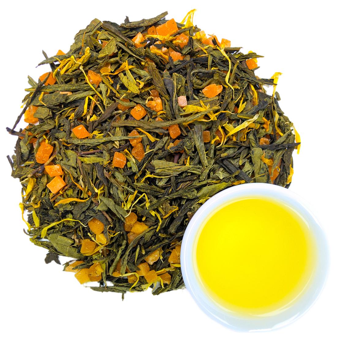 В состав зеленого чая "Солнечный Персик" входят: ароматная китайская сенча, цукаты, золотистые лепестки календулы и ароматические масла.