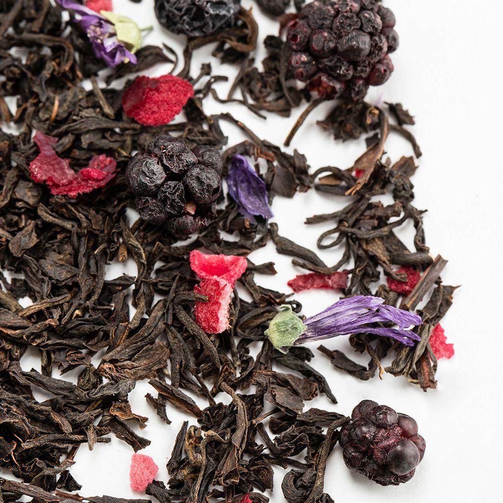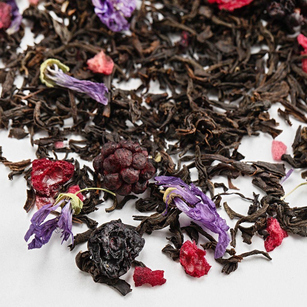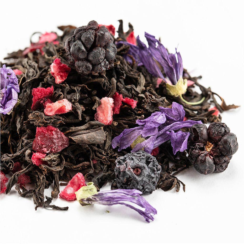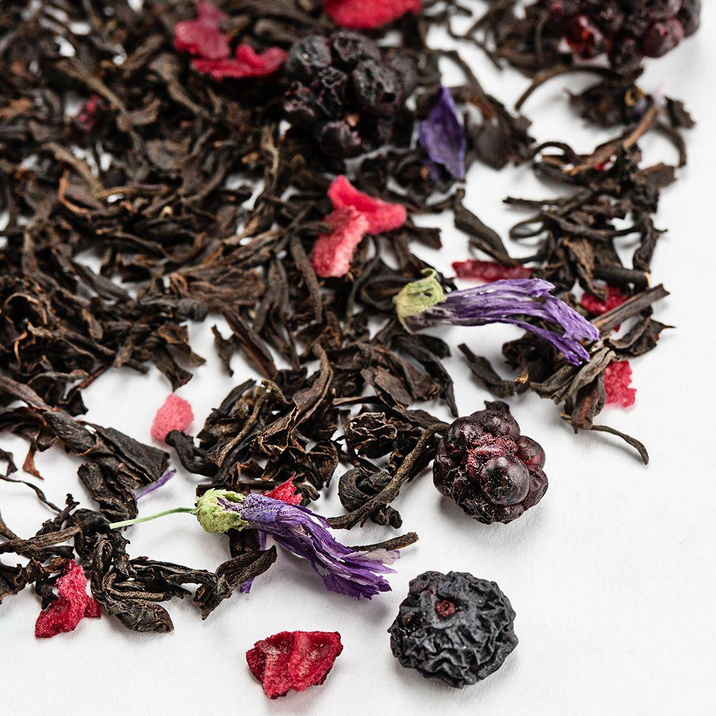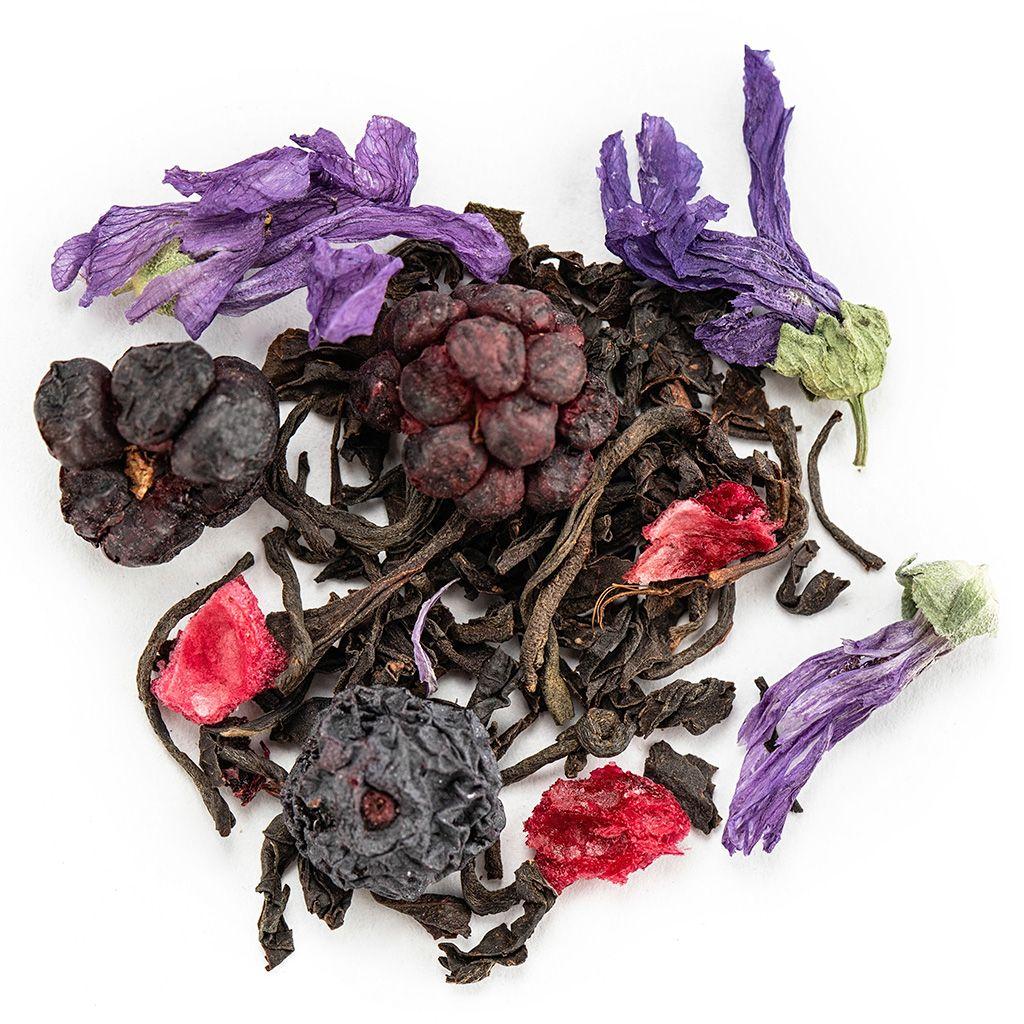 Состав: чай черный индийский, ежевика ягоды, голубика ягоды, мальва цветы, клюква кусочки, аромат лесных ягод.
