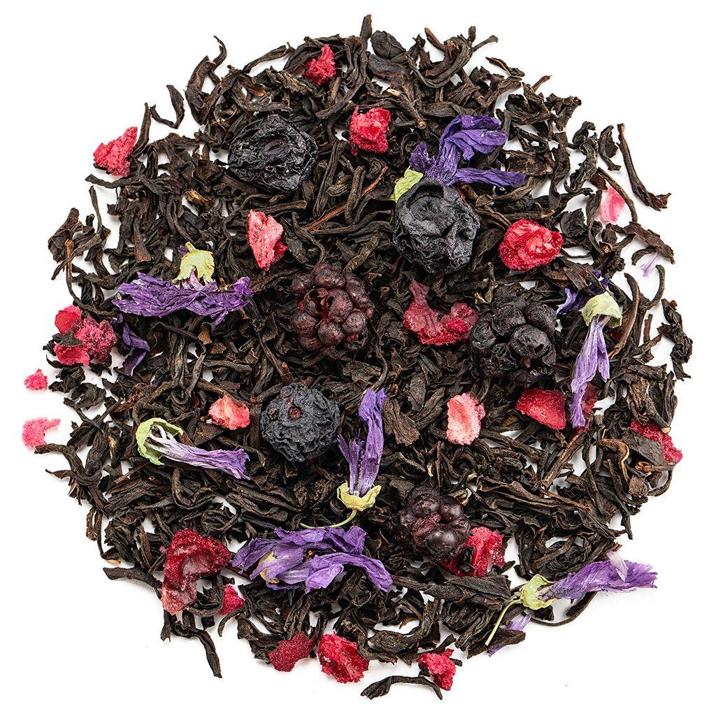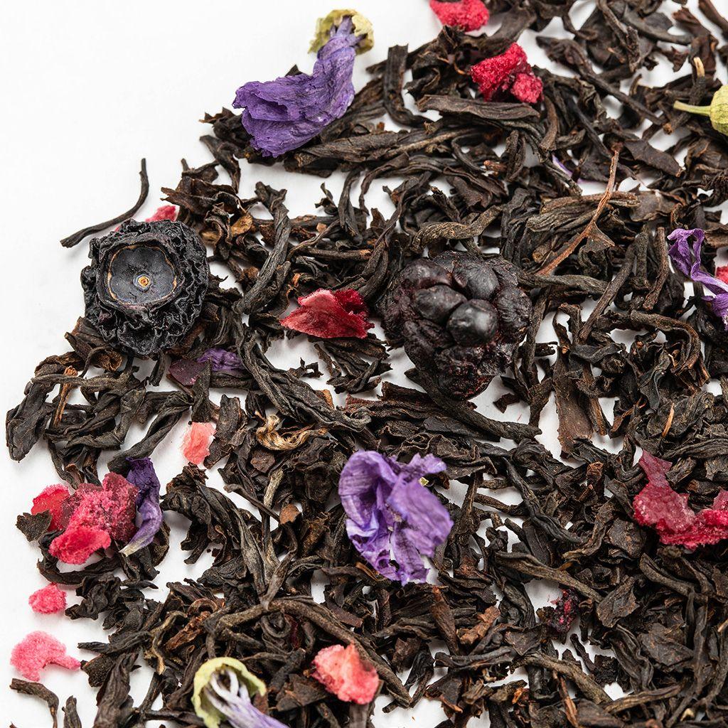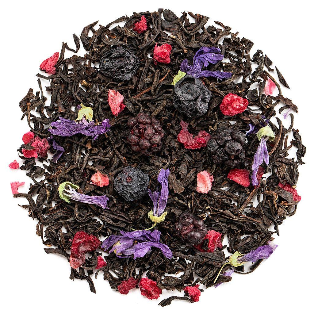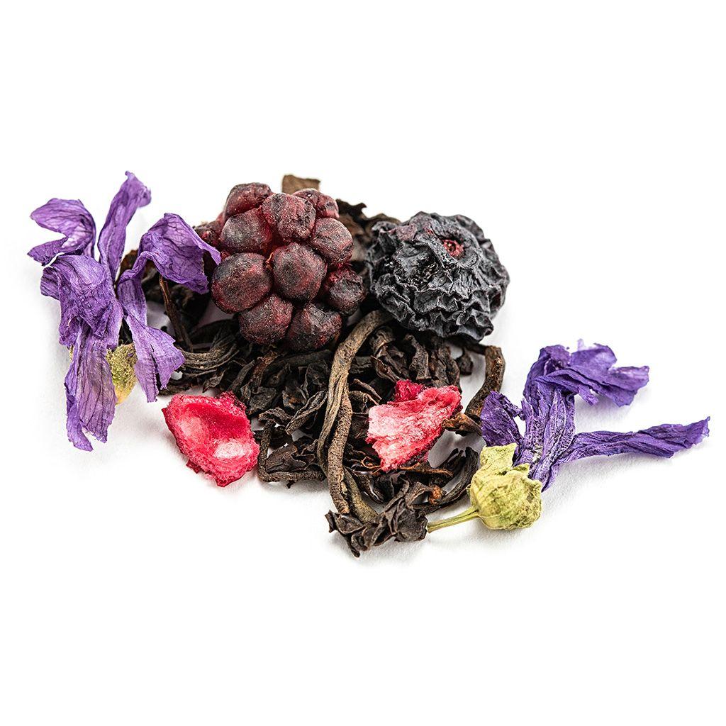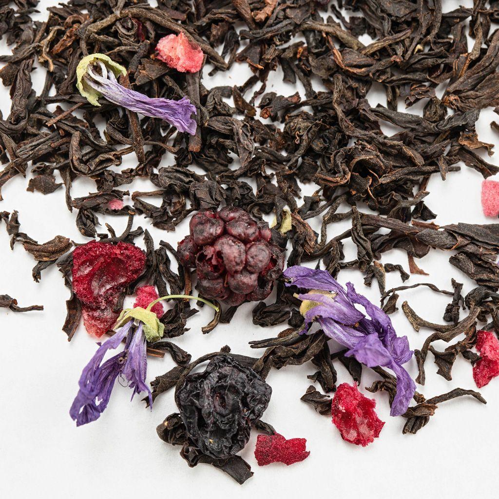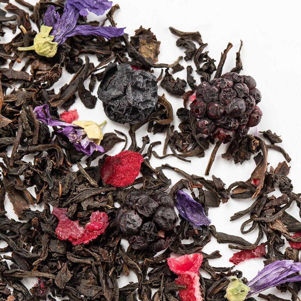 Состав: чай черный индийский, ежевика ягоды, голубика ягоды, мальва цветы, клюква кусочки, аромат лесных ягод.