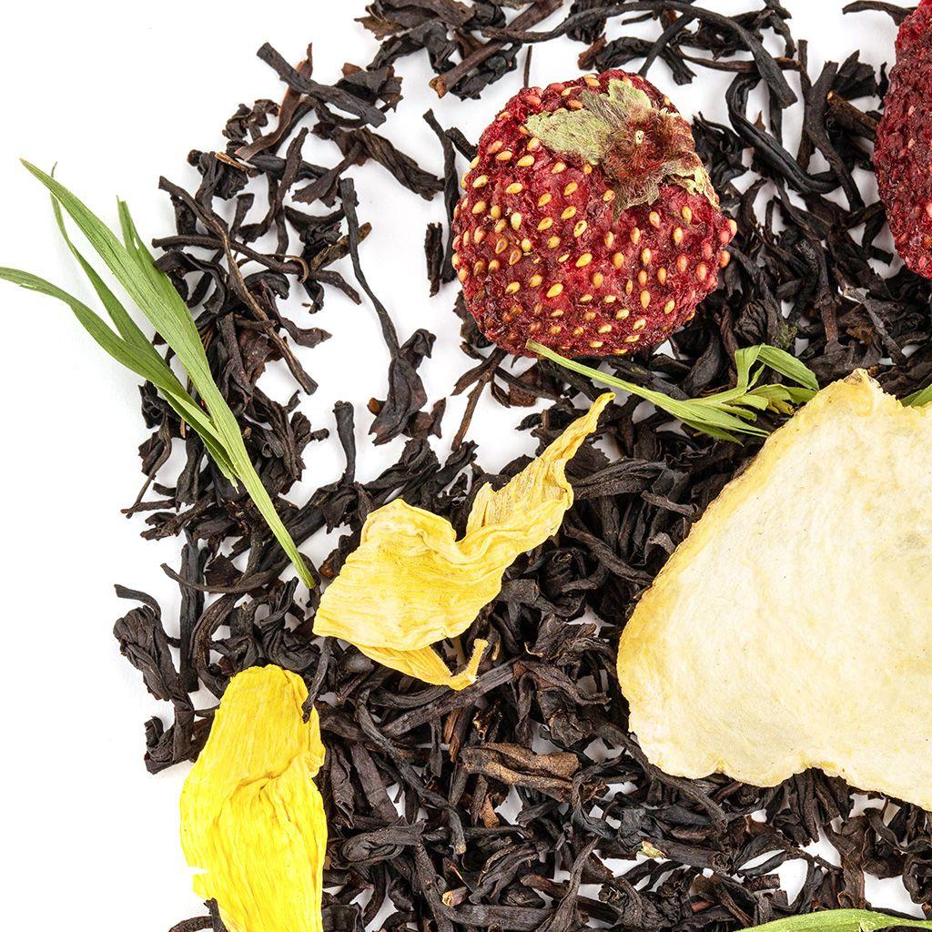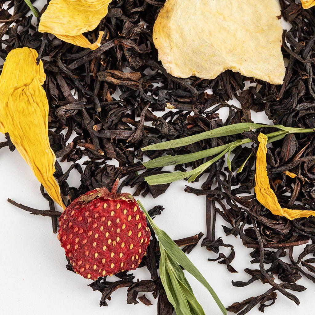 Купаж чёрных чаев с лепестками василька и сафлора, ягодами малины и красной смор...