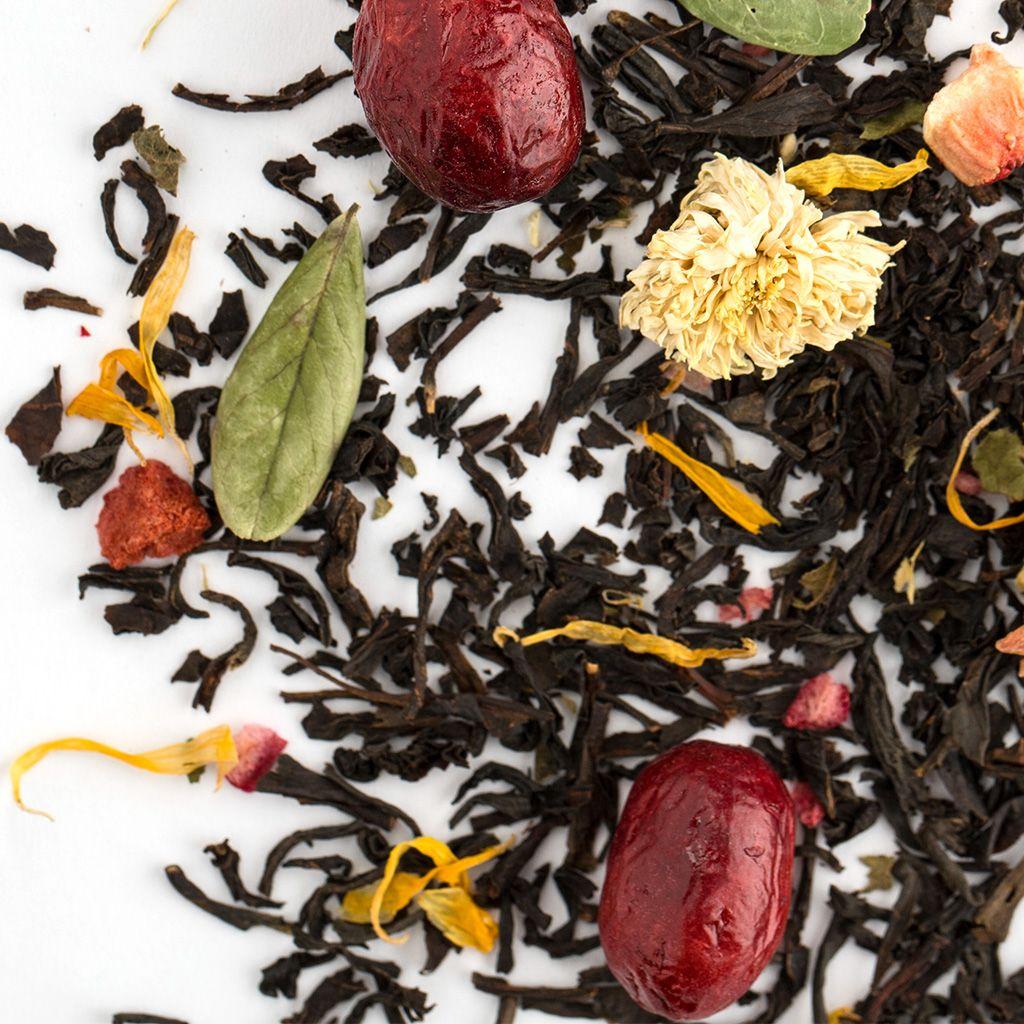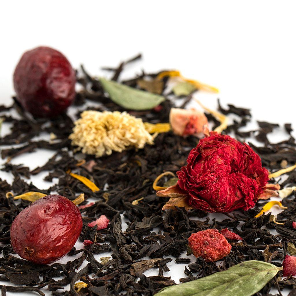 Эффектный купаж на основе черного чая, полный сочных красок, цельных ягод, солне...