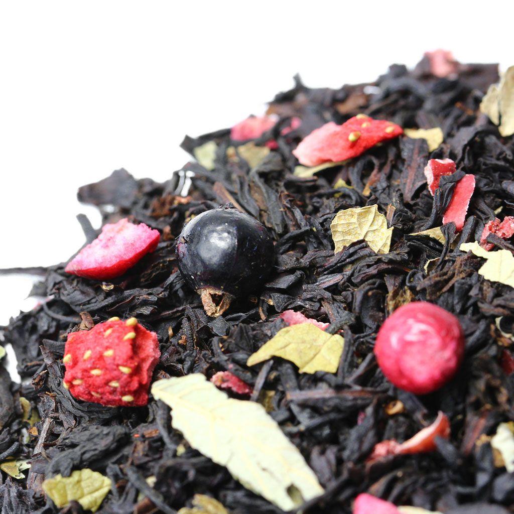 Состав: чай черный индийский, ягоды черной смородины, ягоды красной смородины, кусочки клюквы, кусочки клубники, листья смородины, аромат черной смородины и дикой