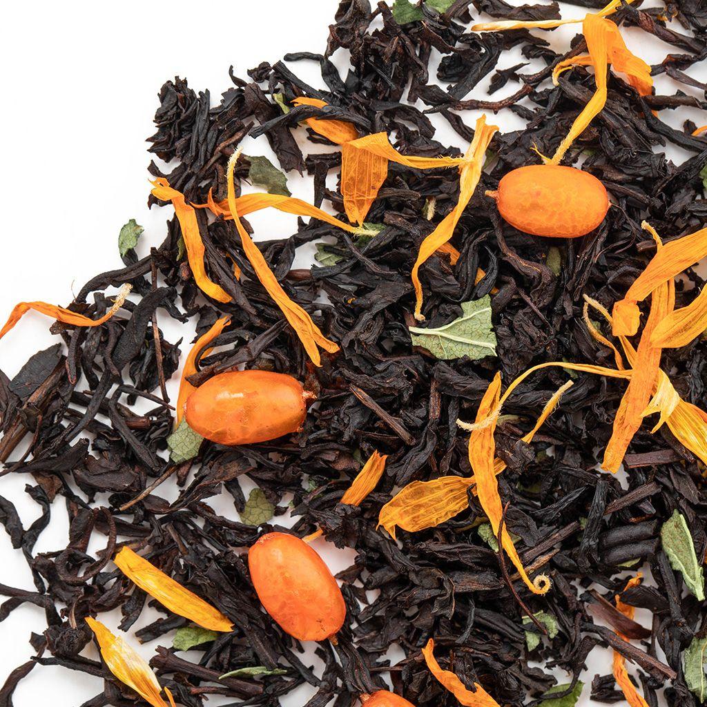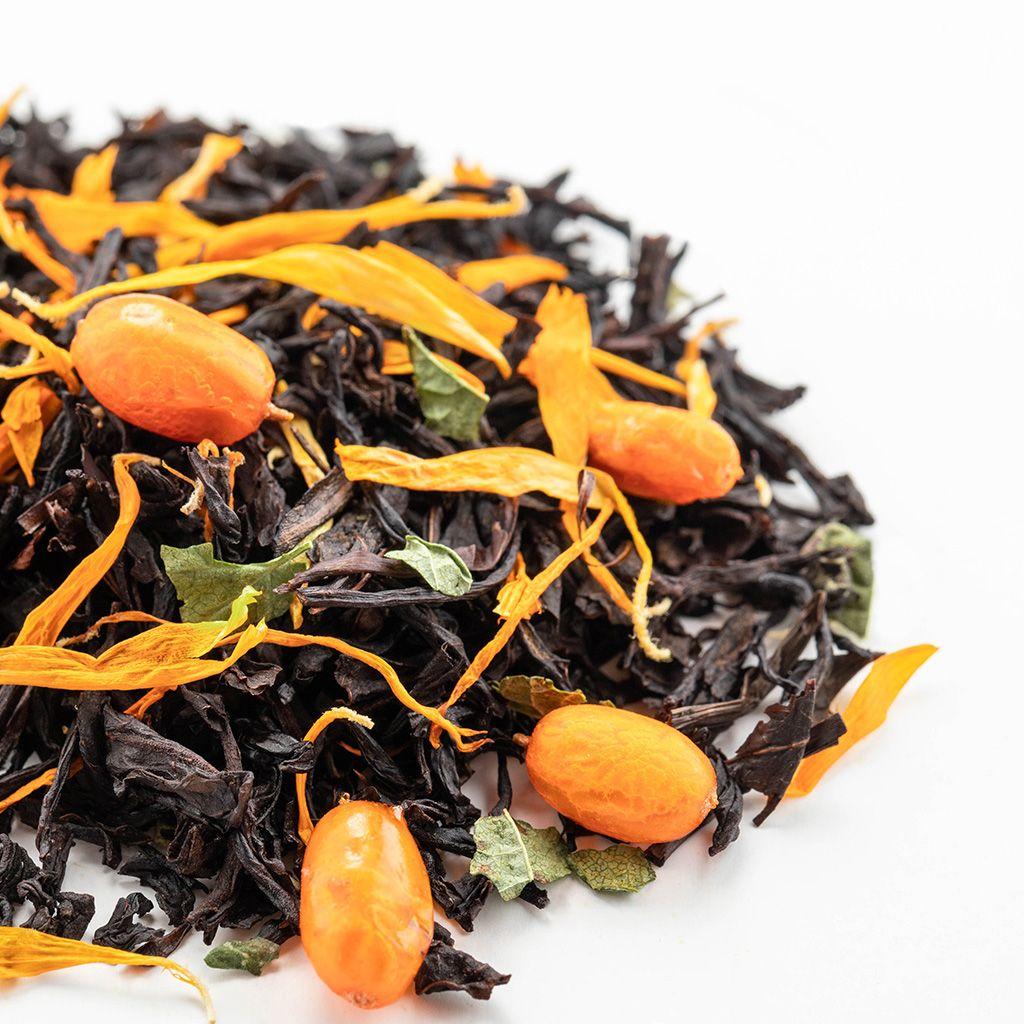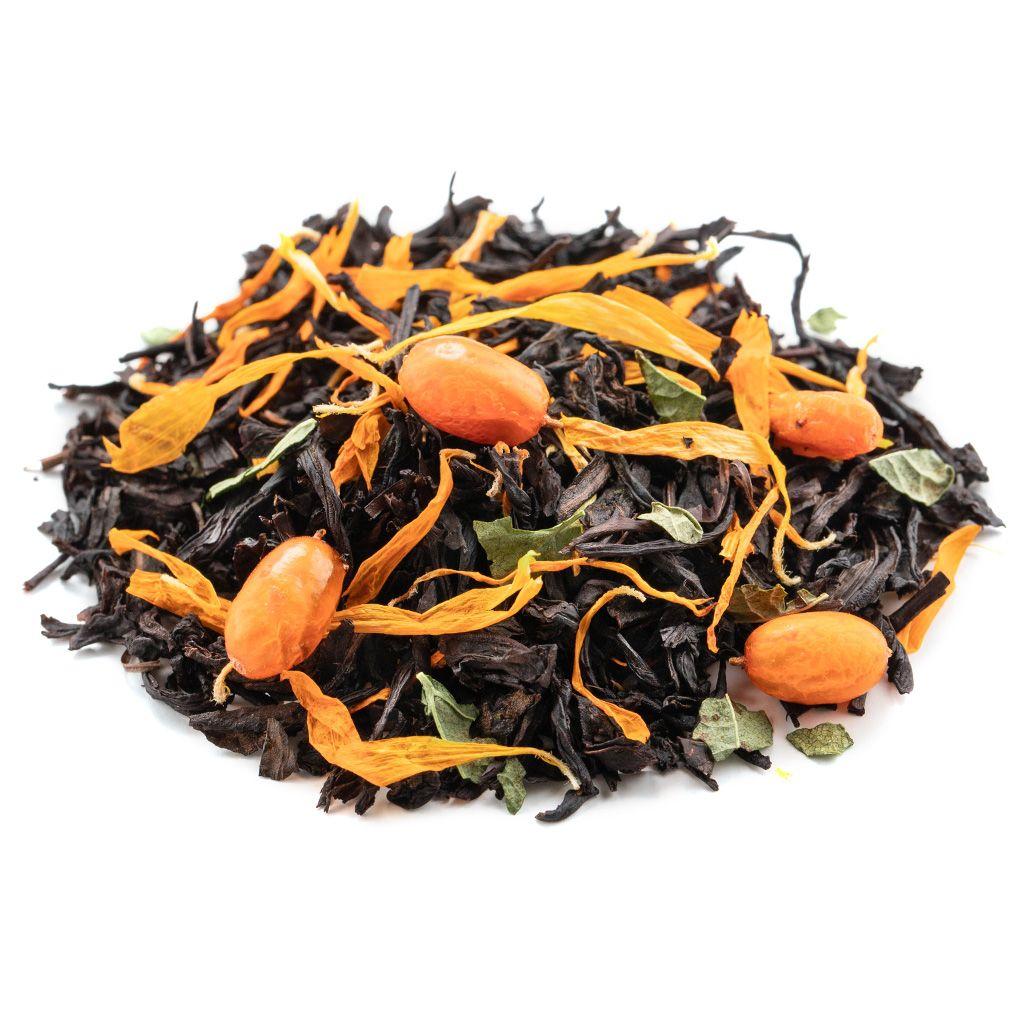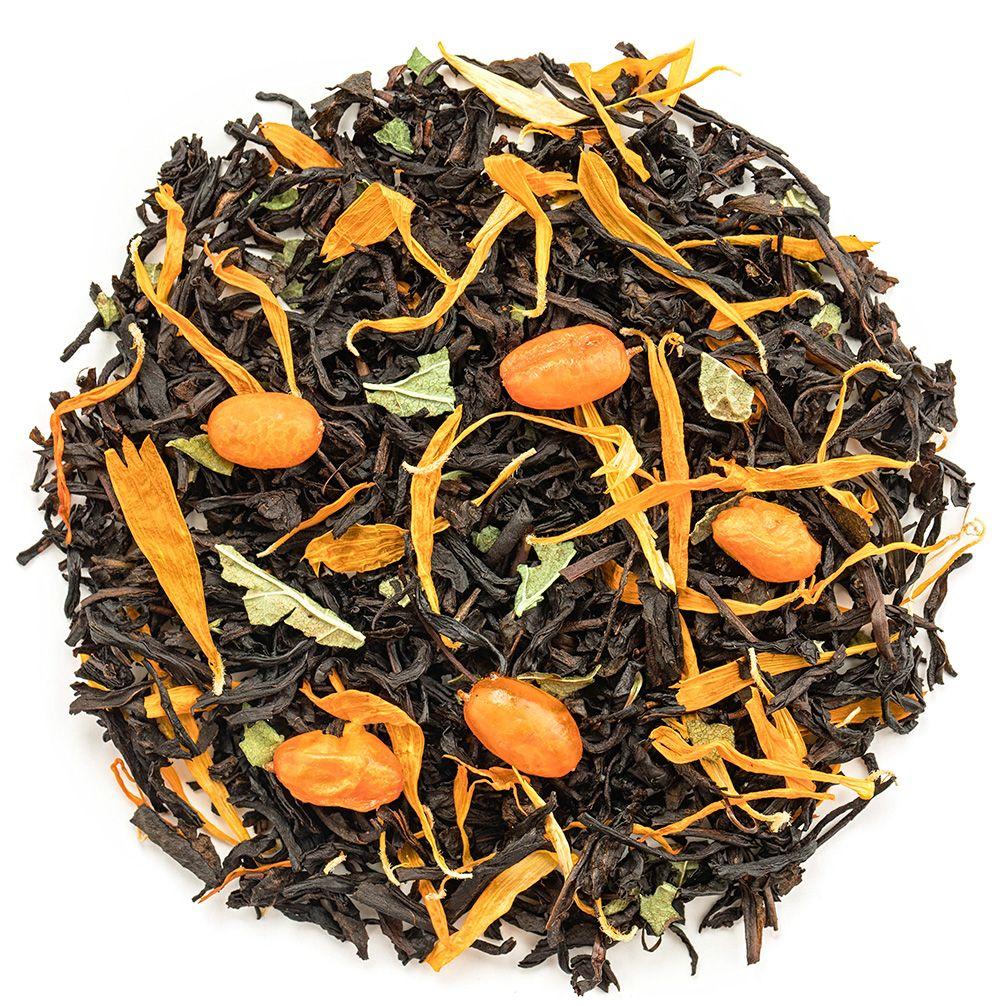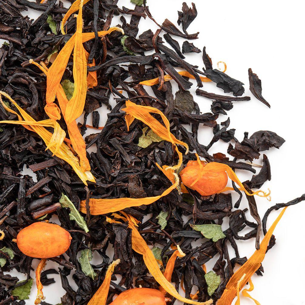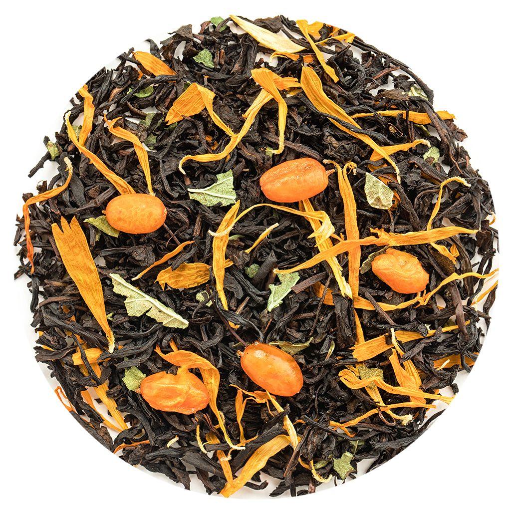 Черный цейлонский чай в дополнении плодов облепихи, листа смородины и лепестков календулы создают головокружительный аромат.
