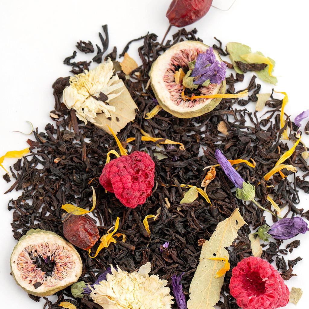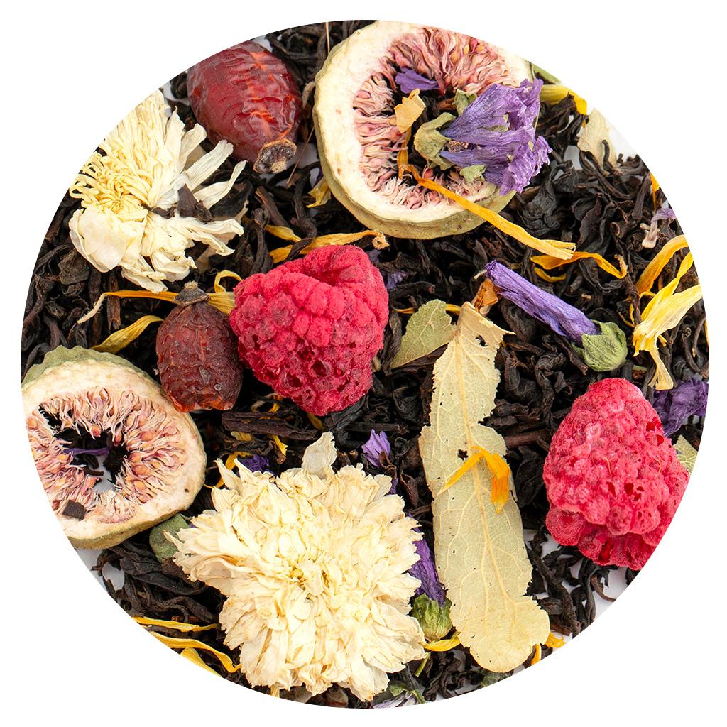 Состав: чай черный индийский, плоды шиповника, ягоды малины, слайсы инжира, липа...