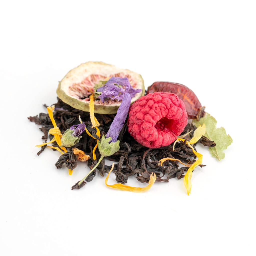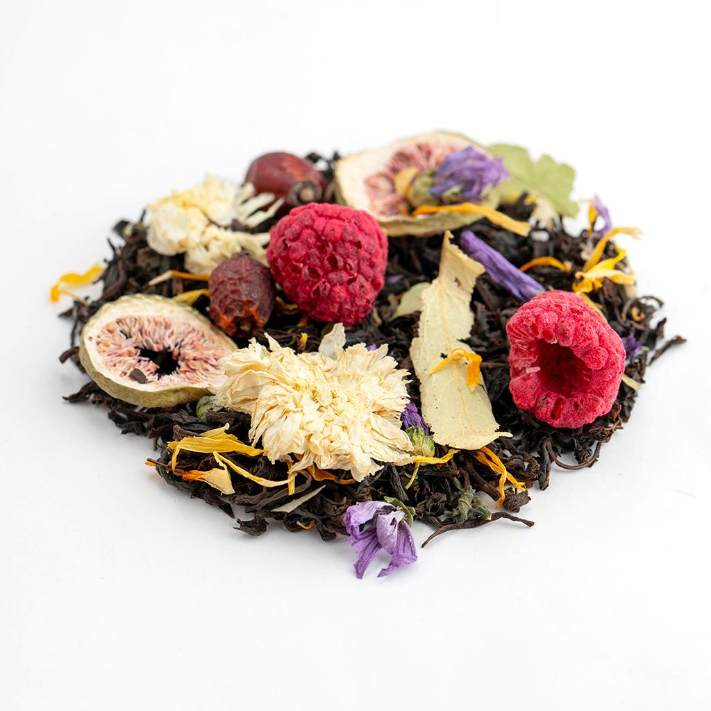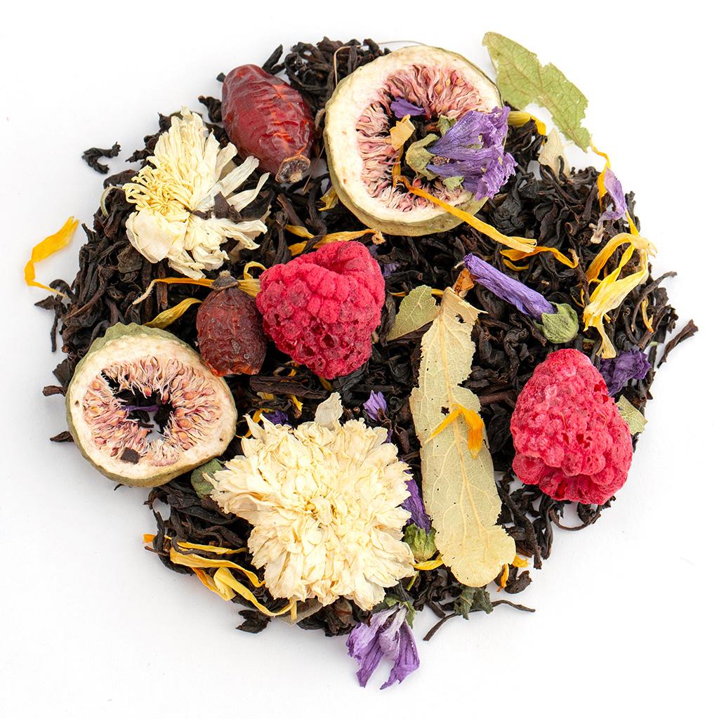 Состав: чай черный индийский, плоды шиповника, ягоды малины, слайсы инжира, липа, хризантема, цветы мальвы, лепестки календулы, аромат фруктового сада.