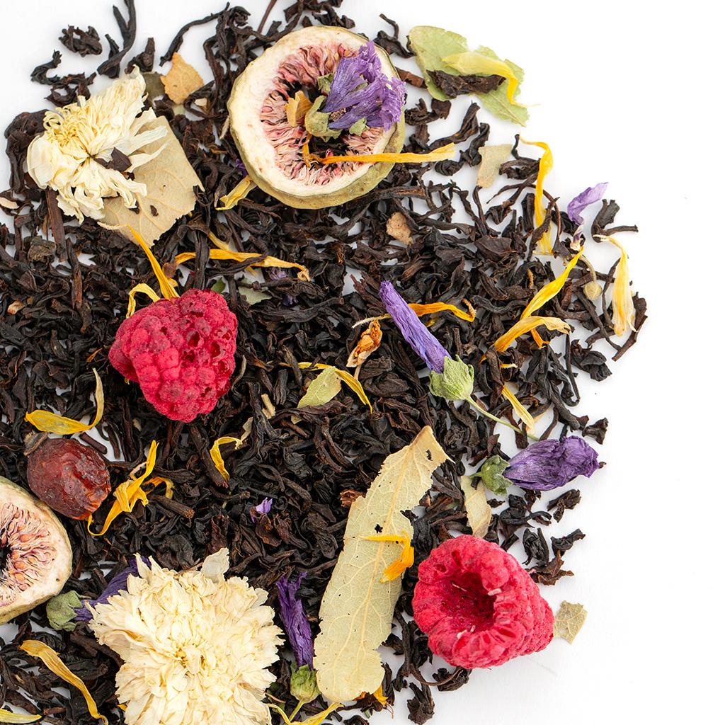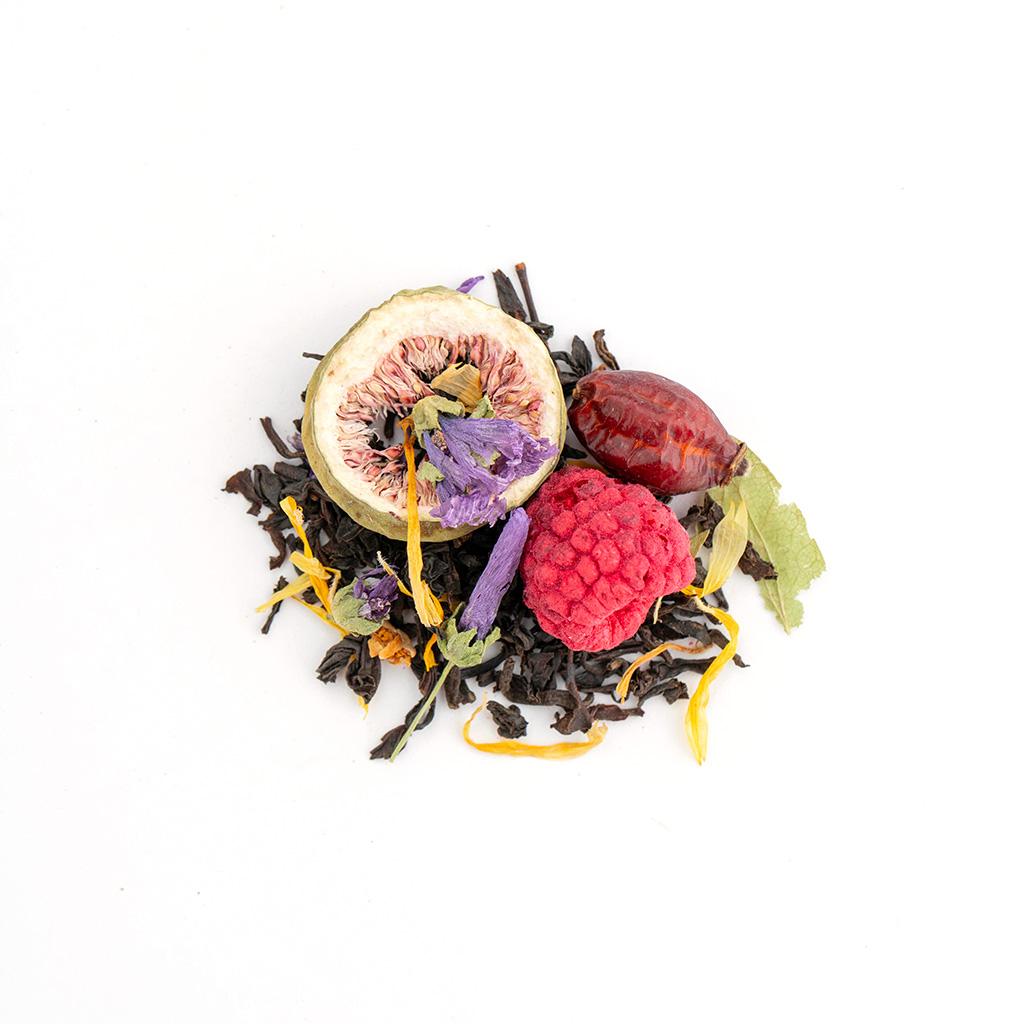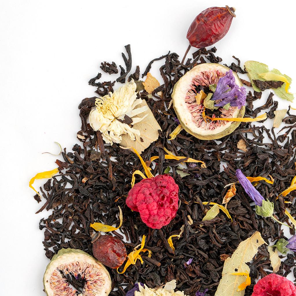 Состав: чай черный индийский, плоды шиповника, ягоды малины, слайсы инжира, липа, хризантема, цветы мальвы, лепестки календулы, аромат фруктового сада.