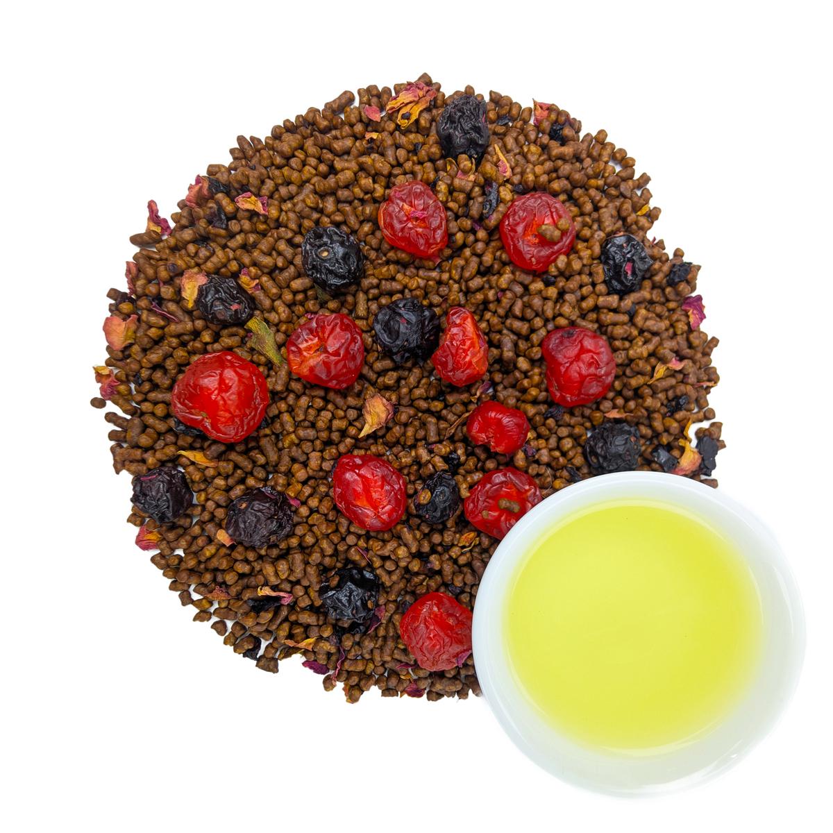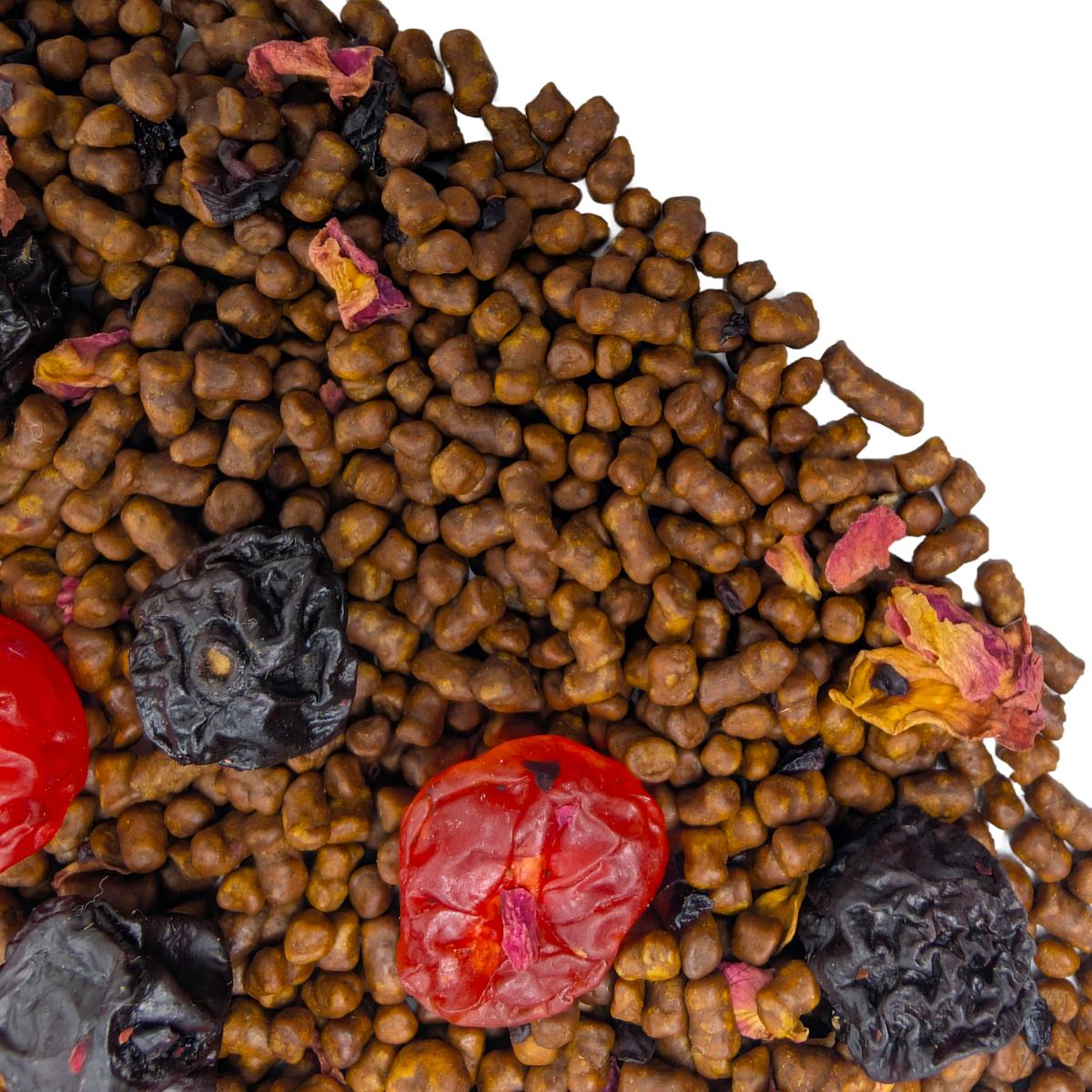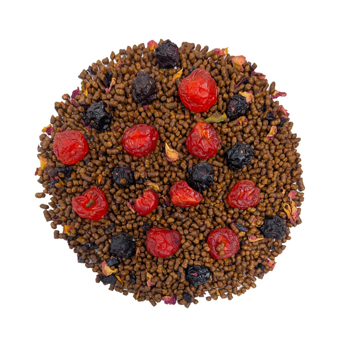 В состав Гречишного чая «Вишня» помимо самого гречишного чая КуЦяо входят кусочки сублимированной вишни, а также целые ягоды сушенной и вяленной вишни, лепестки розы и ароматизатор.