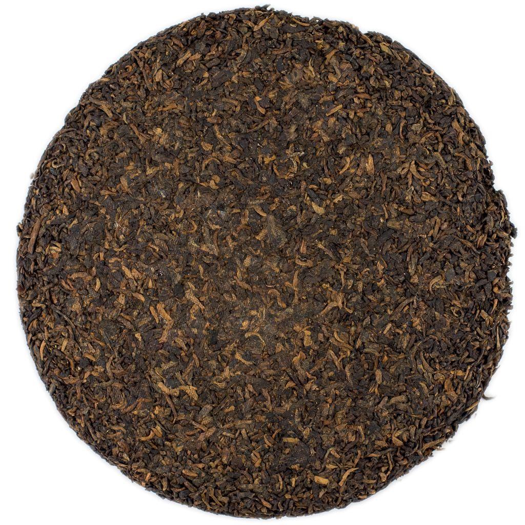 Маленький блинчик темного пуэра из мелколистового сырья с большим количеством почек, очень плотной прессовки.