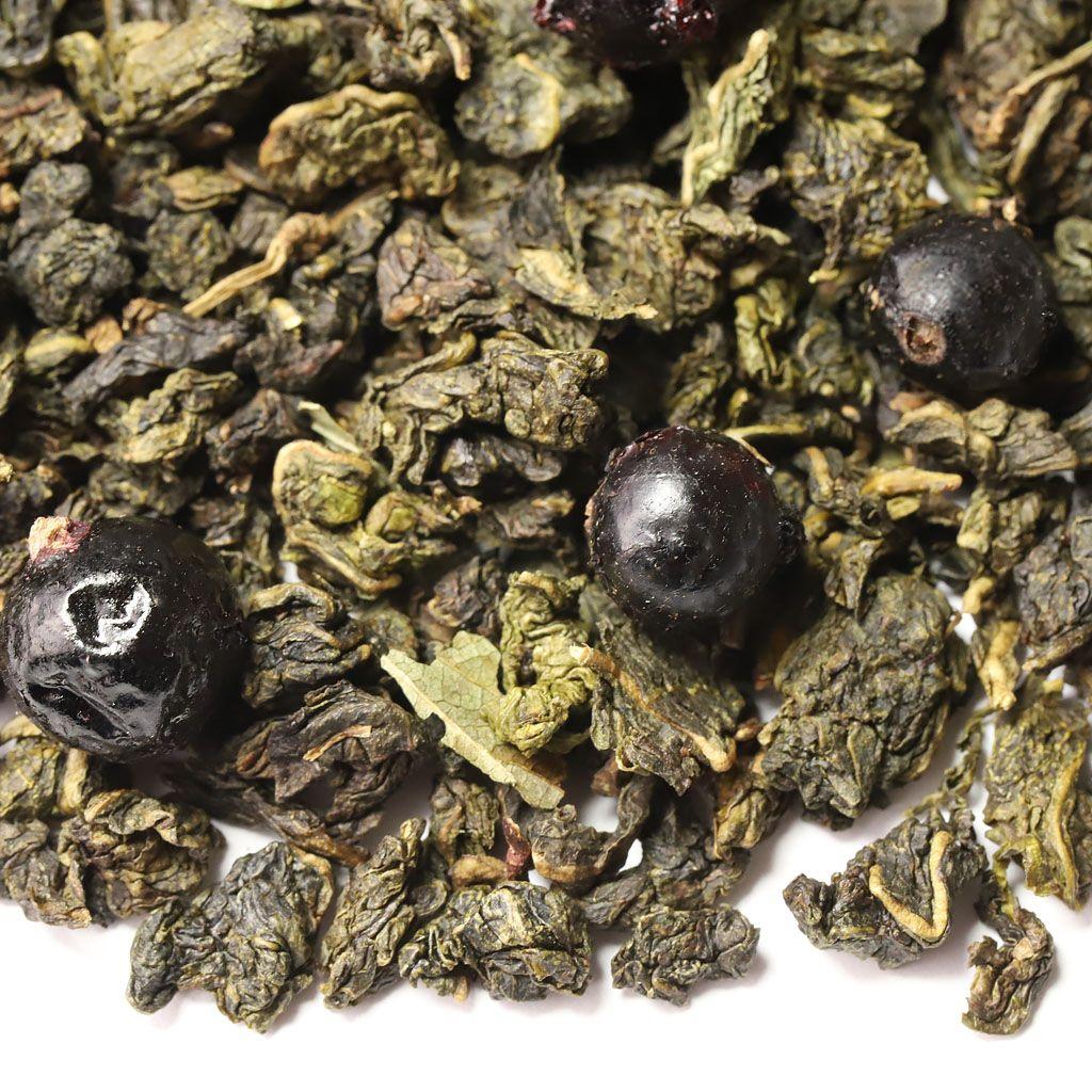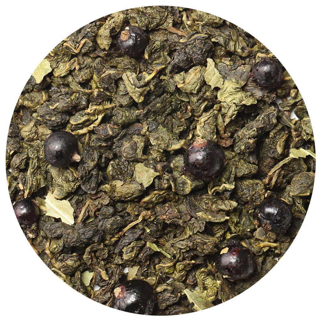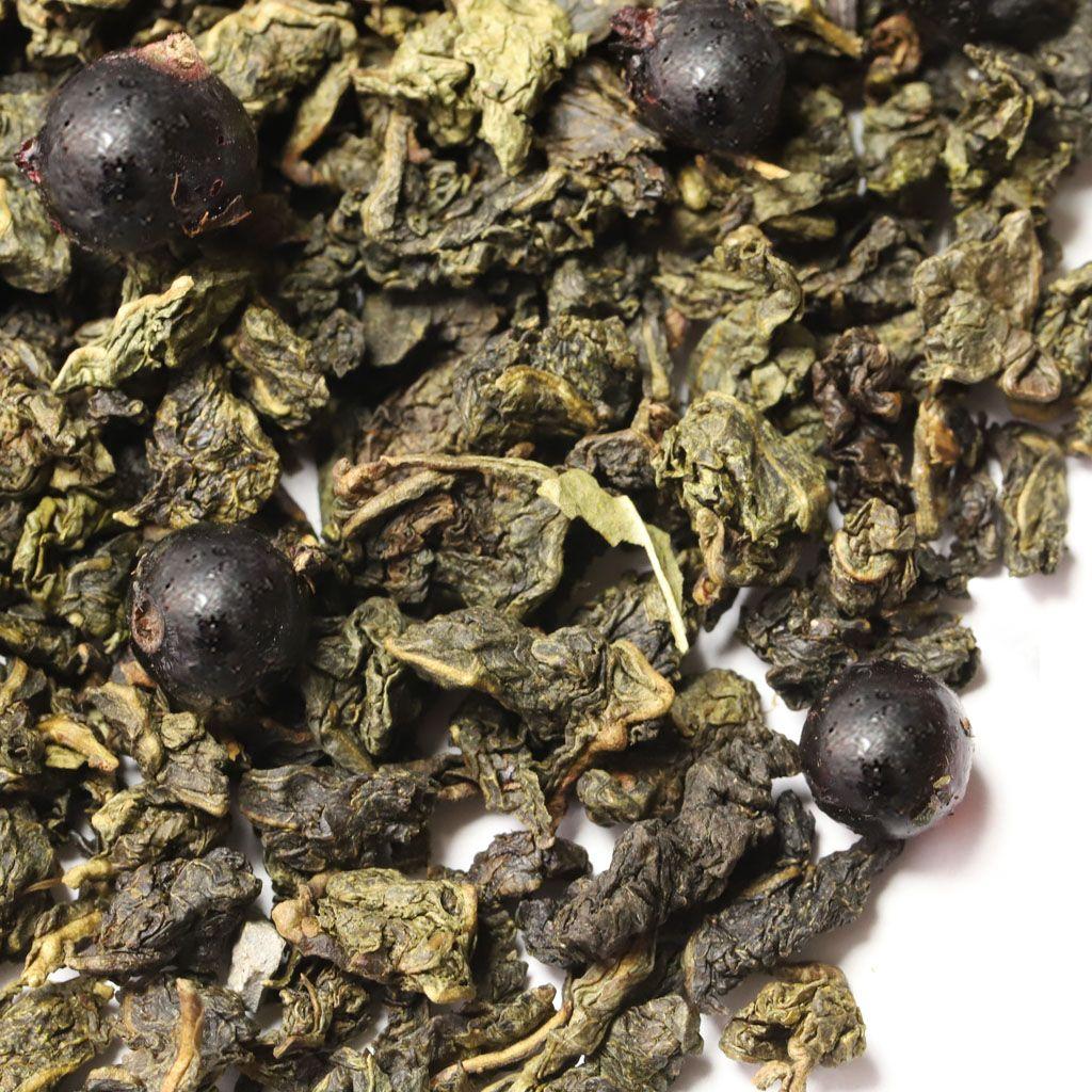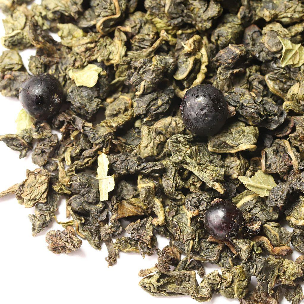 Сквозь изумрудную гущу скрученных листочков китайского улуна проглядывают цельные ягоды и листья черной смородины.