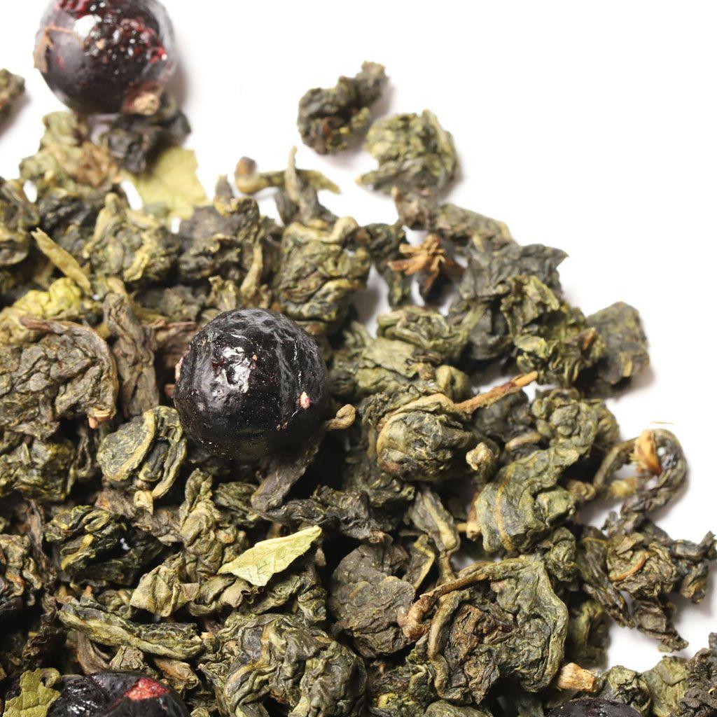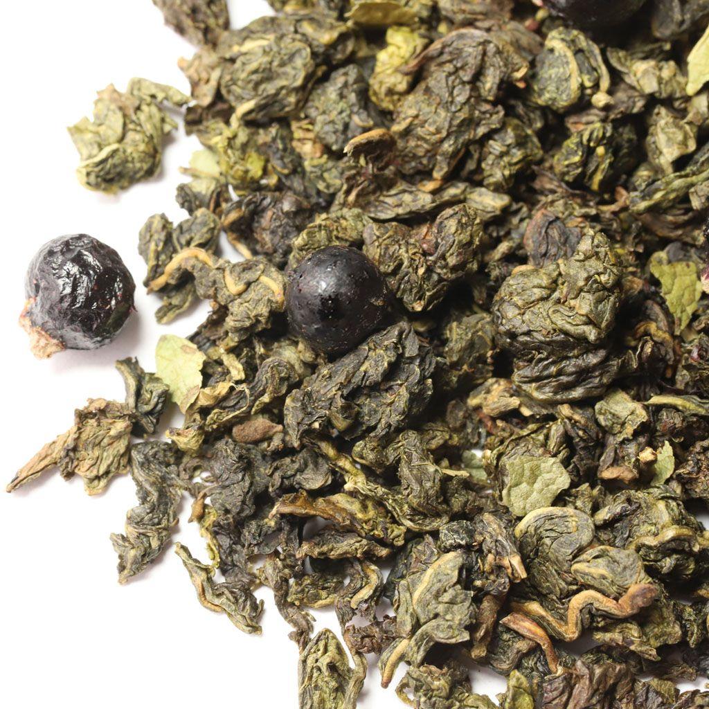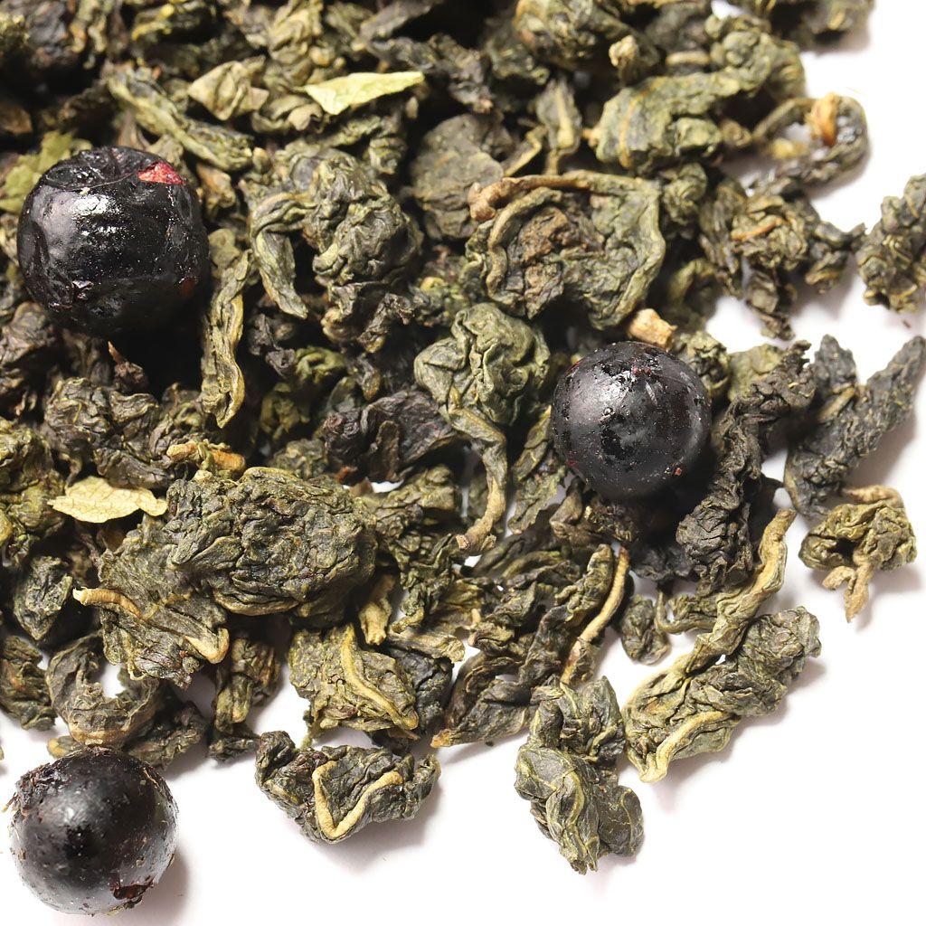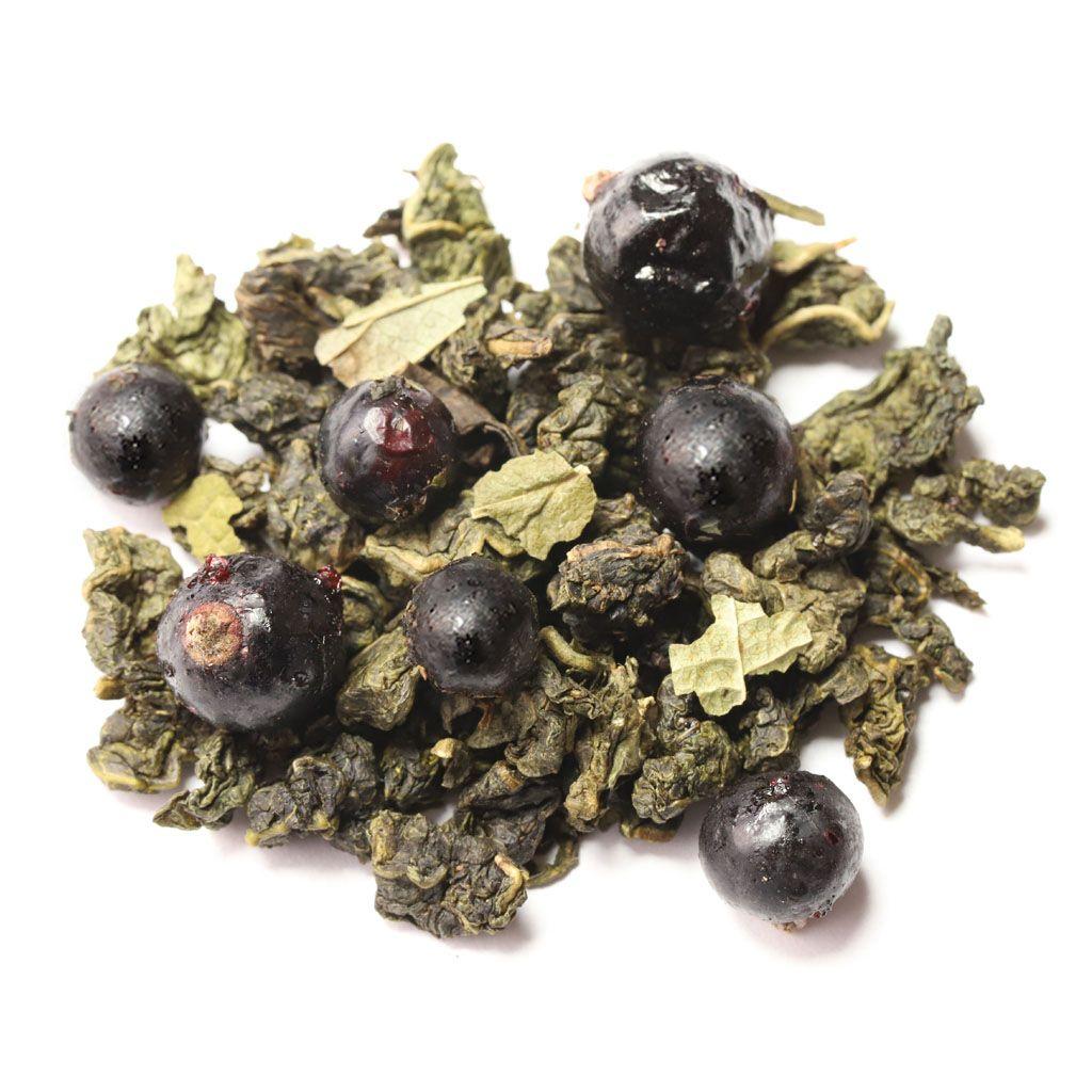 Сквозь изумрудную гущу скрученных листочков китайского улуна проглядывают цельные ягоды и листья черной смородины.