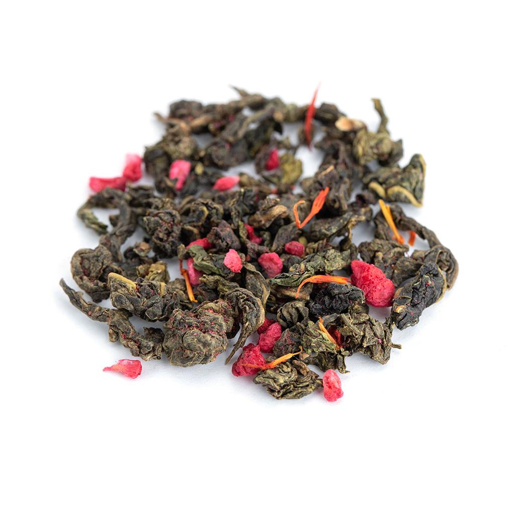 Малиновые кусочки ягод на фоне зеленого чайного листа смотрятся свежо и ярко.