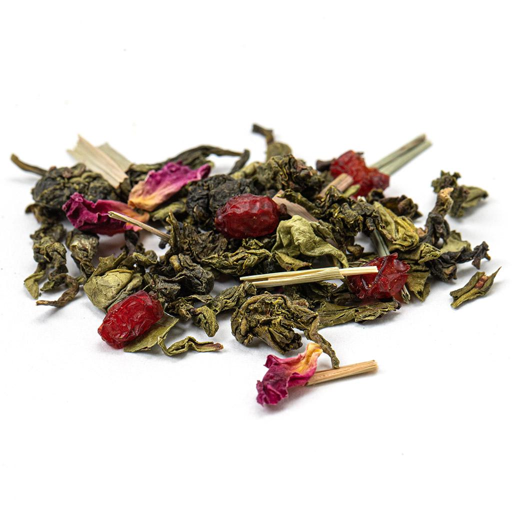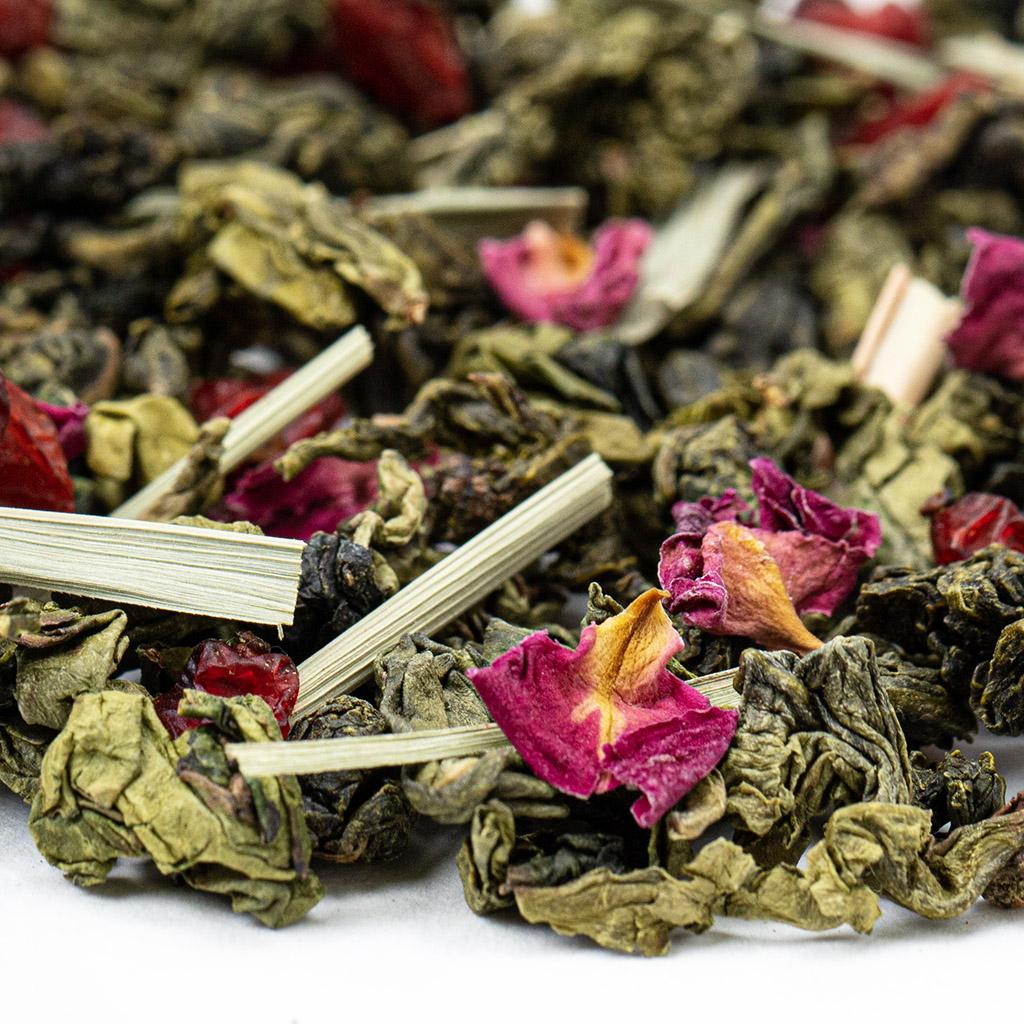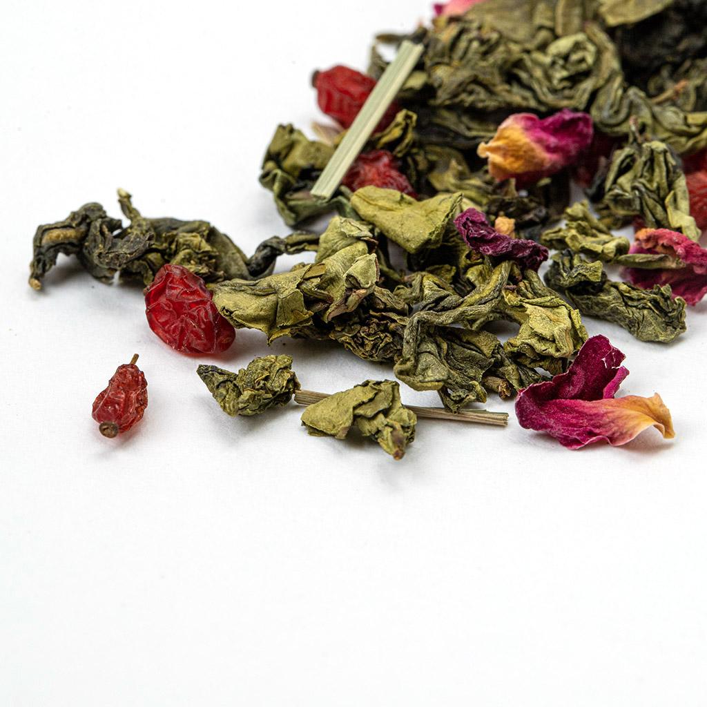 Лепестки розы — символ нежности и романтики — рассыпаны по смеси, как алые штрихи на холсте. Они вносят мягкий, цветочный акцент, который обволакивает и придаёт чаю утончённый шарм.