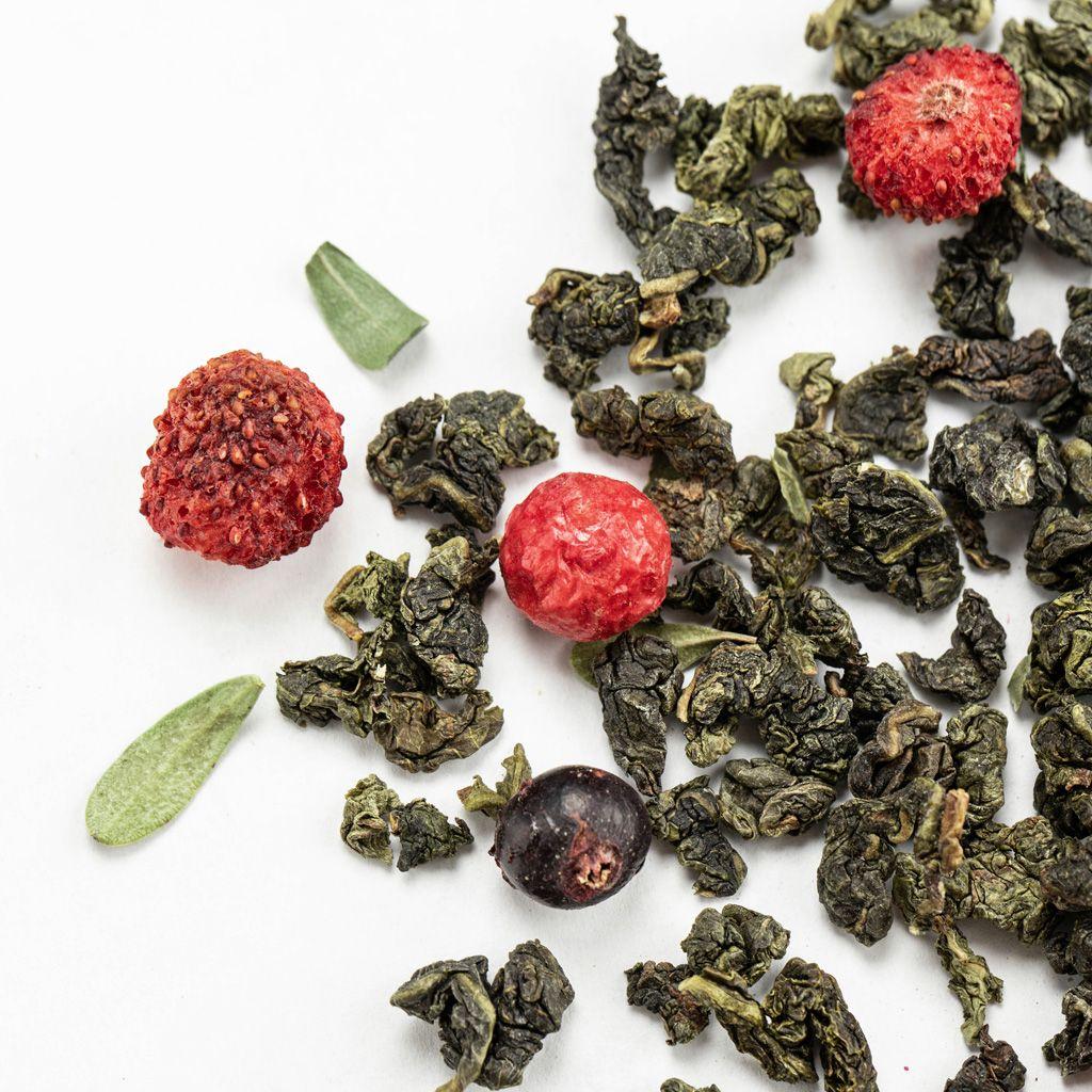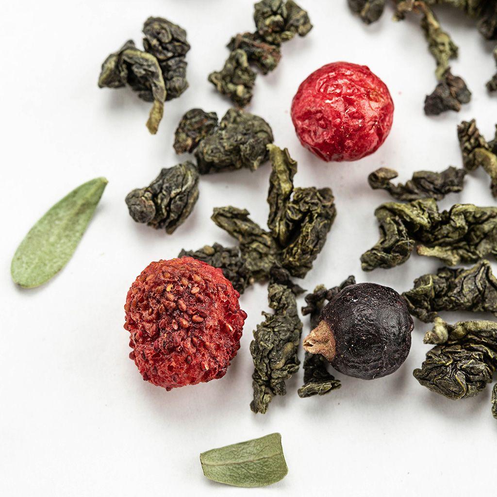 Высокогорный светлый улун из садов Нинся с цветами жасмина и алыми плодами годжи...