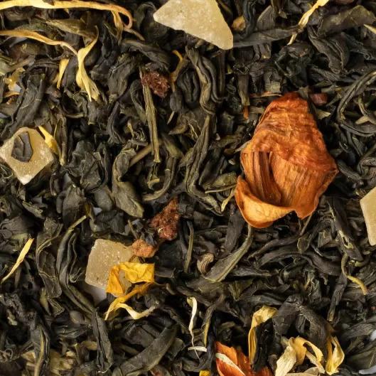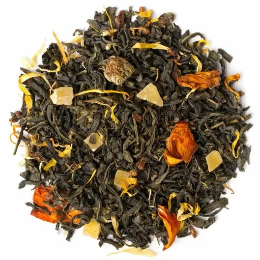 Купаж из четырёх видов зелёного чая с кусочками ананаса и манго, с лепестками календулы, сафлора и подсолнечника, и сладким османтусом.