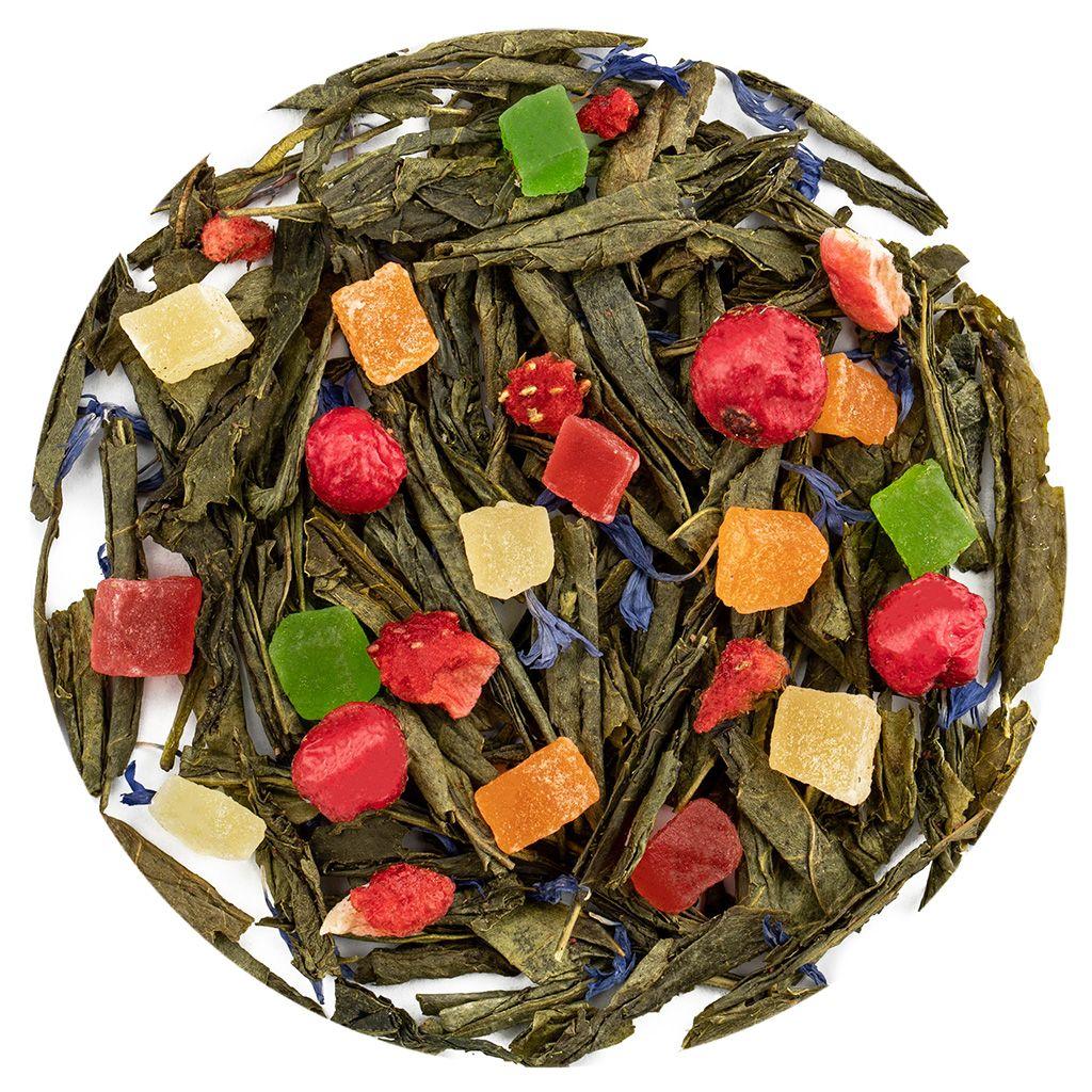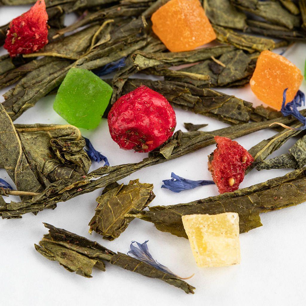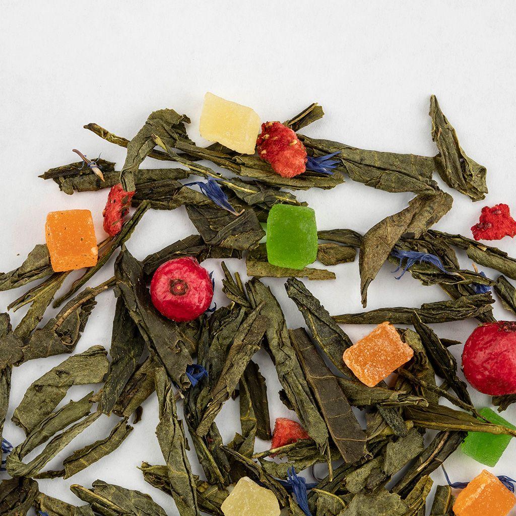 Купаж из четырёх видов зелёного чая с кусочками ананаса и манго, с лепестками ка...
