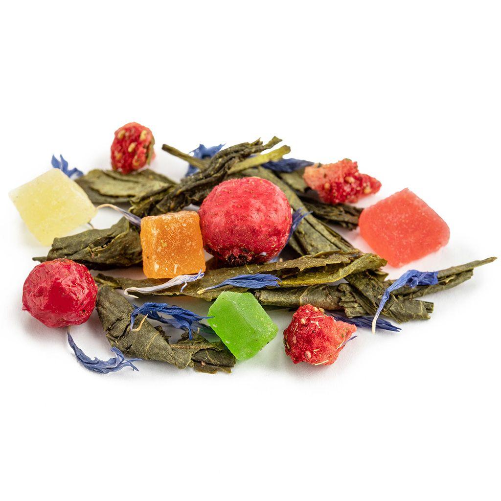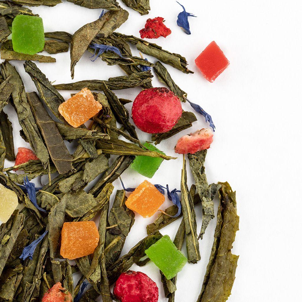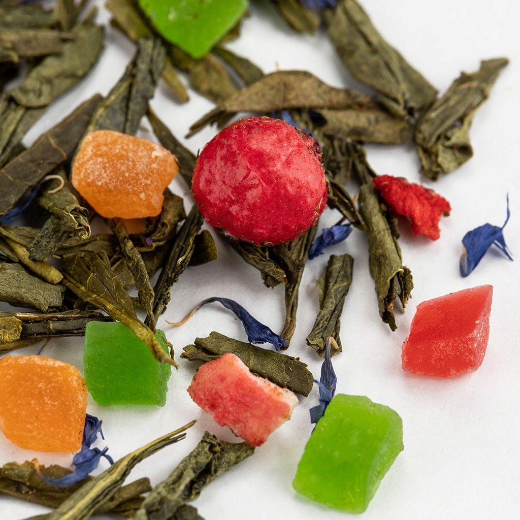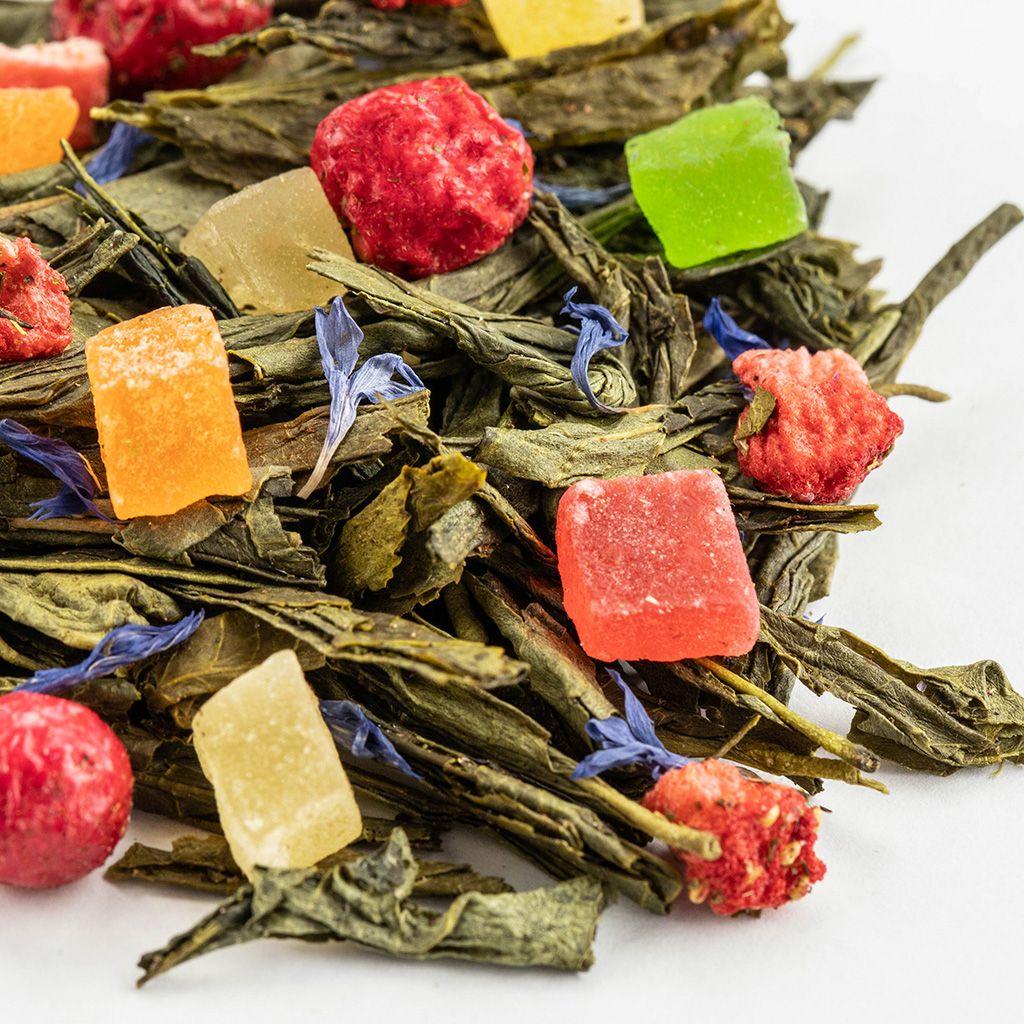 Купаж из четырёх видов зелёного чая с кусочками ананаса и манго, с лепестками ка...