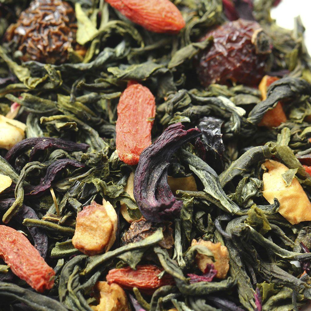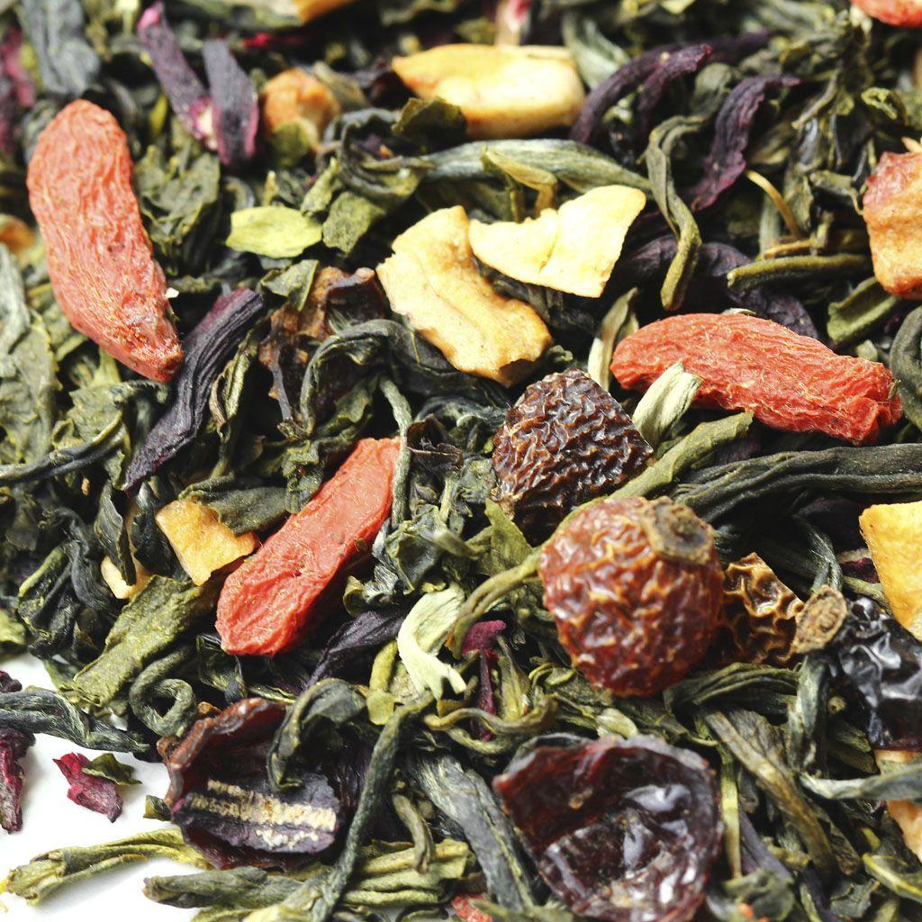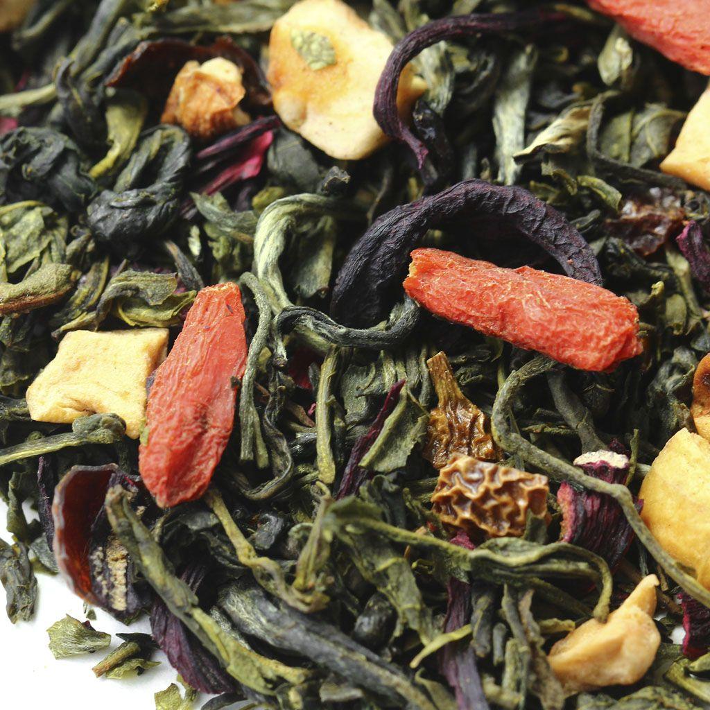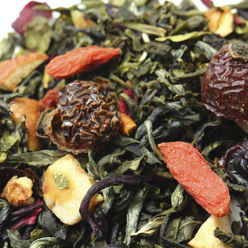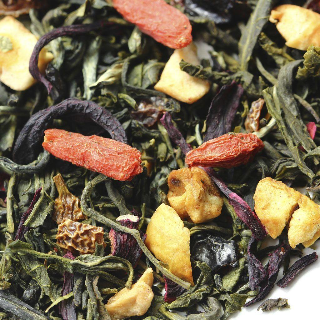 Кусочки яблок, ягоды годжи и измельченные плоды шиповника нестандартный коктейль, приправленный зеленым китайским чаем ганпаудер и лепестками каркадэ и напоенный фруктовым ароматом айвы.