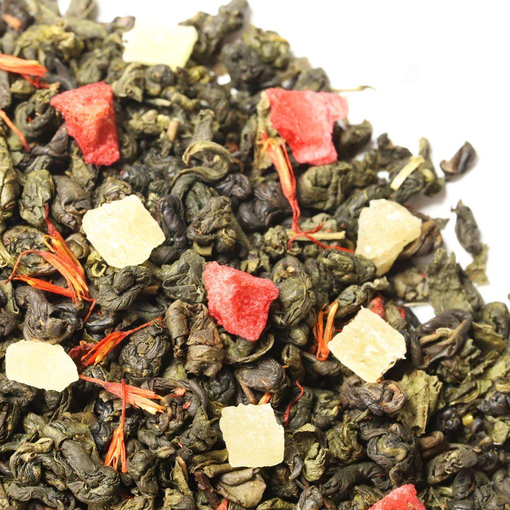 Купаж из четырёх видов зелёного чая с кусочками ананаса и манго, с лепестками ка...