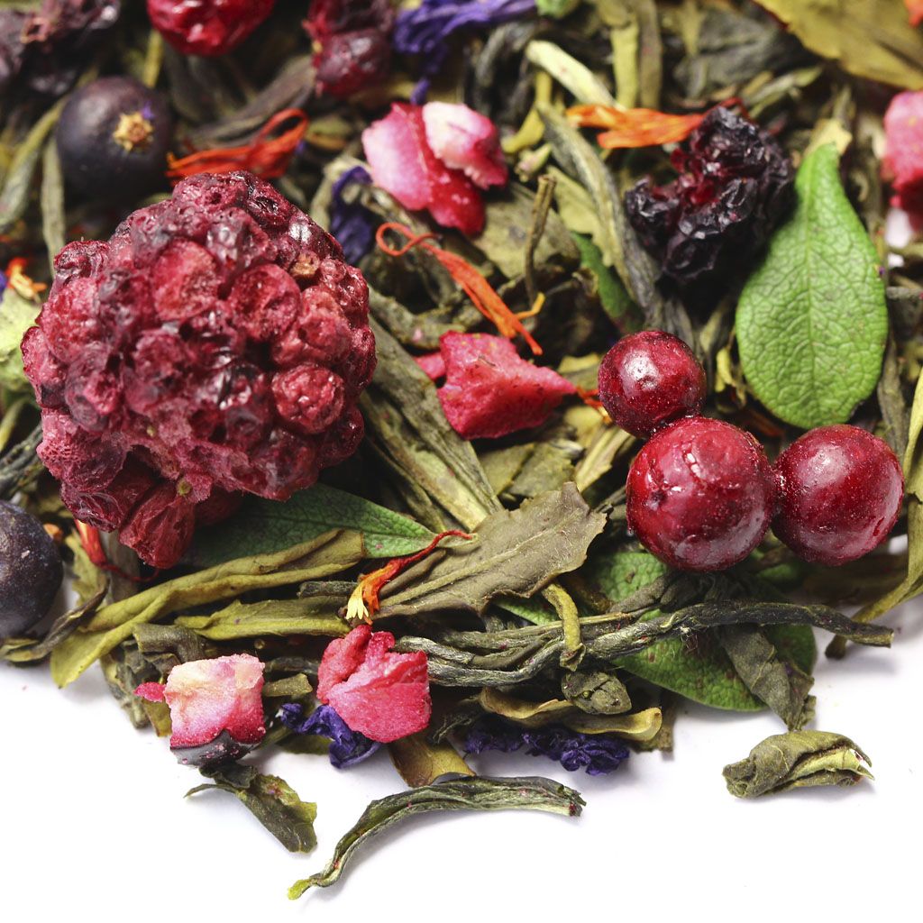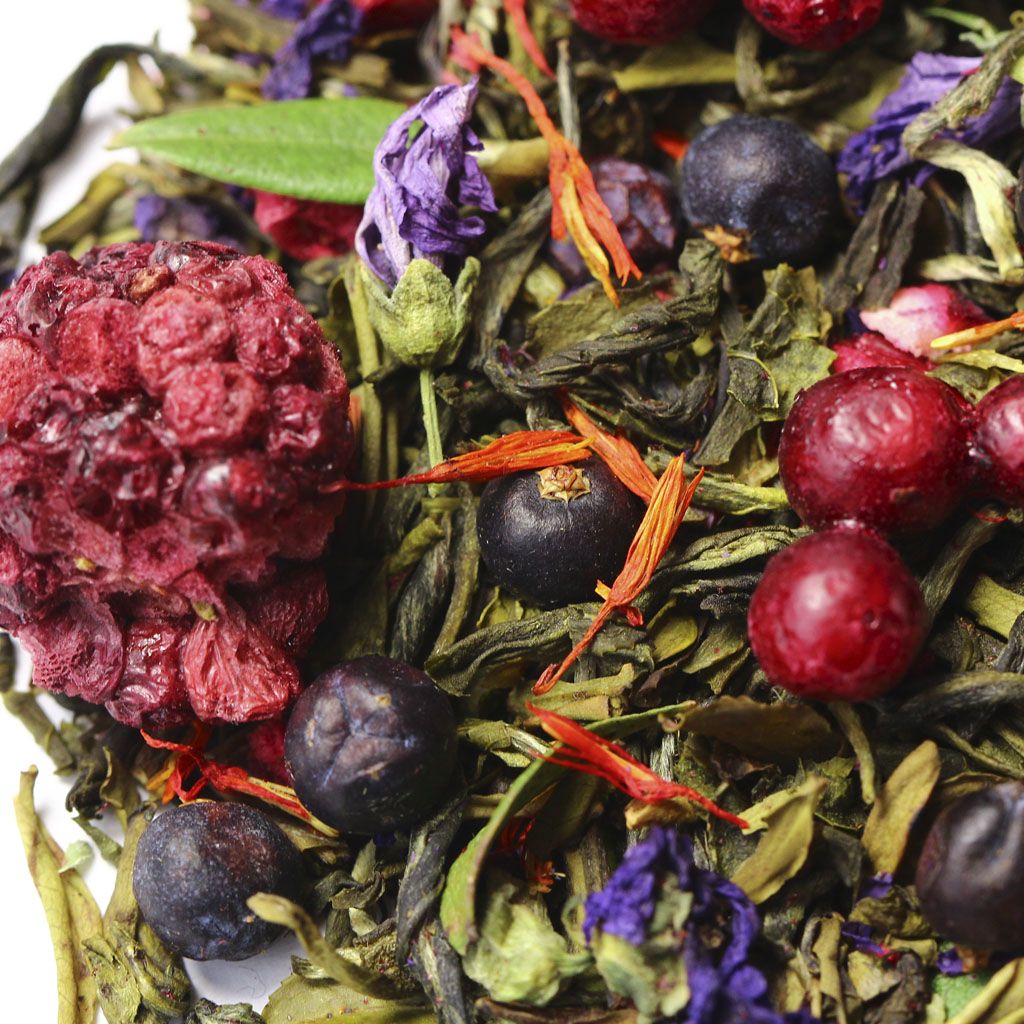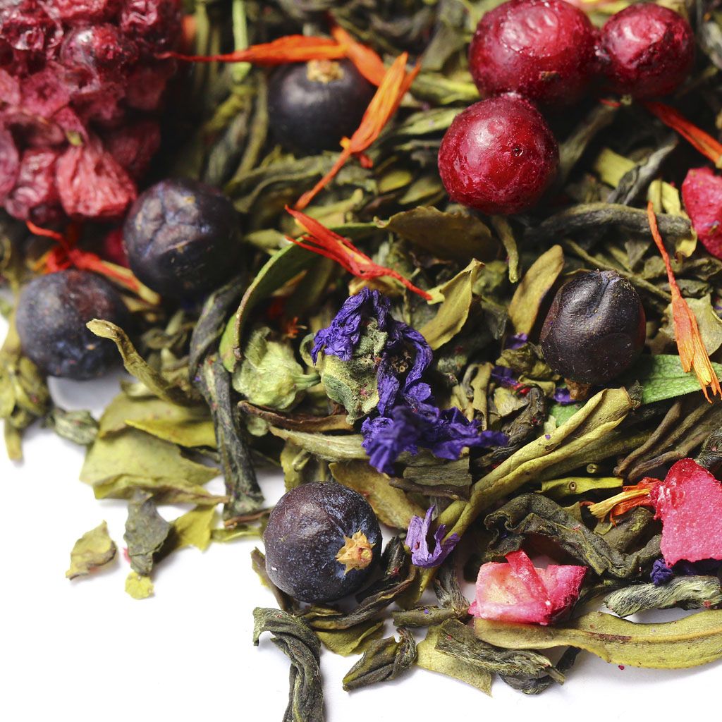 Чай зеленый китайский, целые ягоды ежевики, ягоды брусники, плоды можжевельника, кусочки клюквы, кусочки ежевики, цветы мальвы, лепестки сафлора, листья брусники.