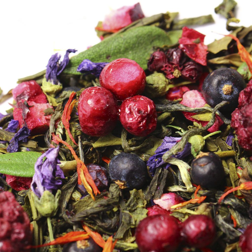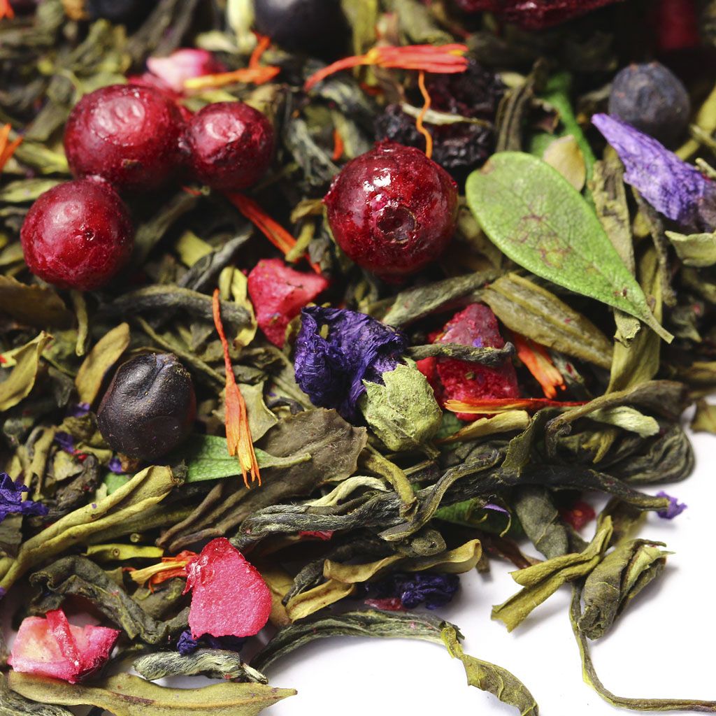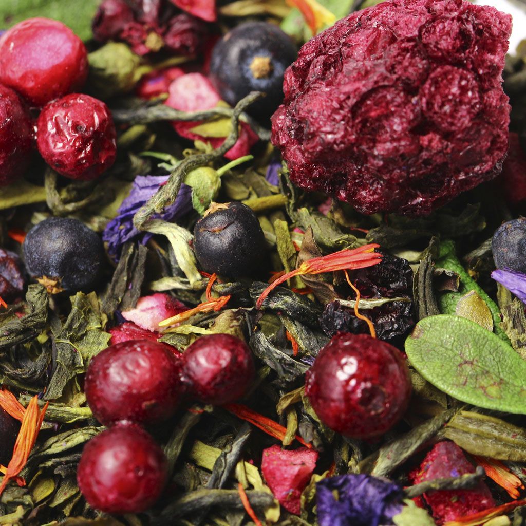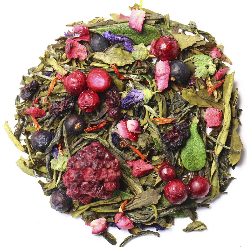 Чай зеленый китайский, целые ягоды ежевики, ягоды брусники, плоды можжевельника, кусочки клюквы, кусочки ежевики, цветы мальвы, лепестки сафлора, листья брусники.